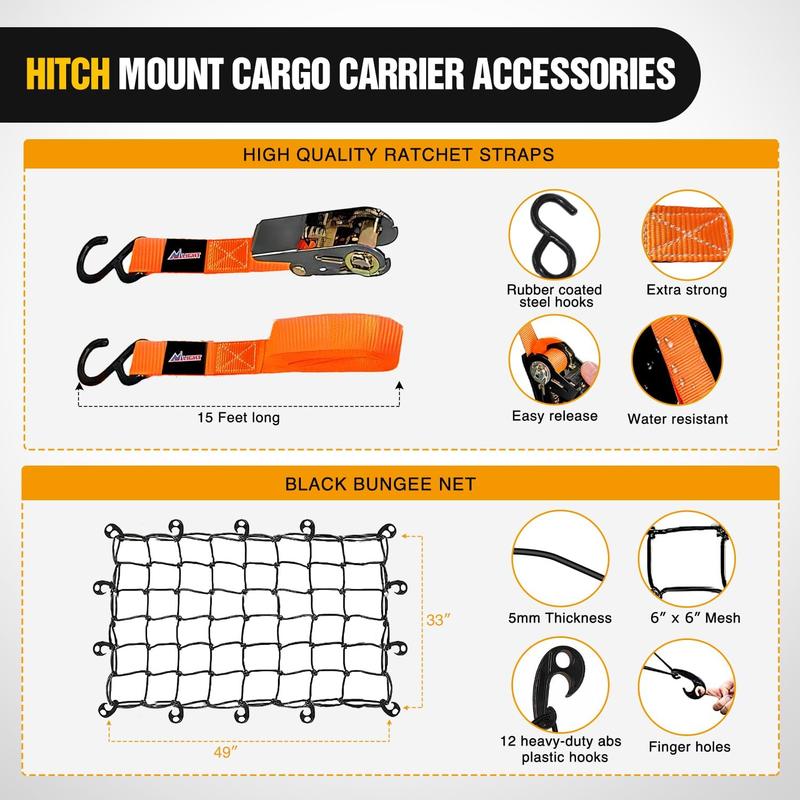 ·【SAFE & SECURE 】- Our soft shell waterproof cargo bag is 44"L x 34"W x 17"H and has a storage carry bag for your cargo bag , making it easy to store without mess when not in use. It comes with 8 buckle straps, 2 rainproof ratchet straps, a 49" x 33" extra-thick 5mm heavy-duty cargo net for added security for your trailer hitch great vehicle cargo baskets.