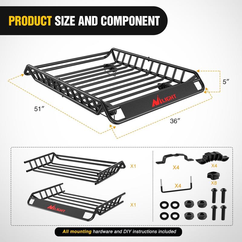 ·【DIMENSION AND LOAD CAPACITY】- Nilight 51" x 36" x 5" Universal Roof Rack Cargo Basket. With a 200 lb capacity and extendable design, our cargo rooftop carrier easily attaches to any vehicle with cross bars. This vehicle roof cargo basket will work well with any vehicle; a car, van,pickup truck, or SUV.