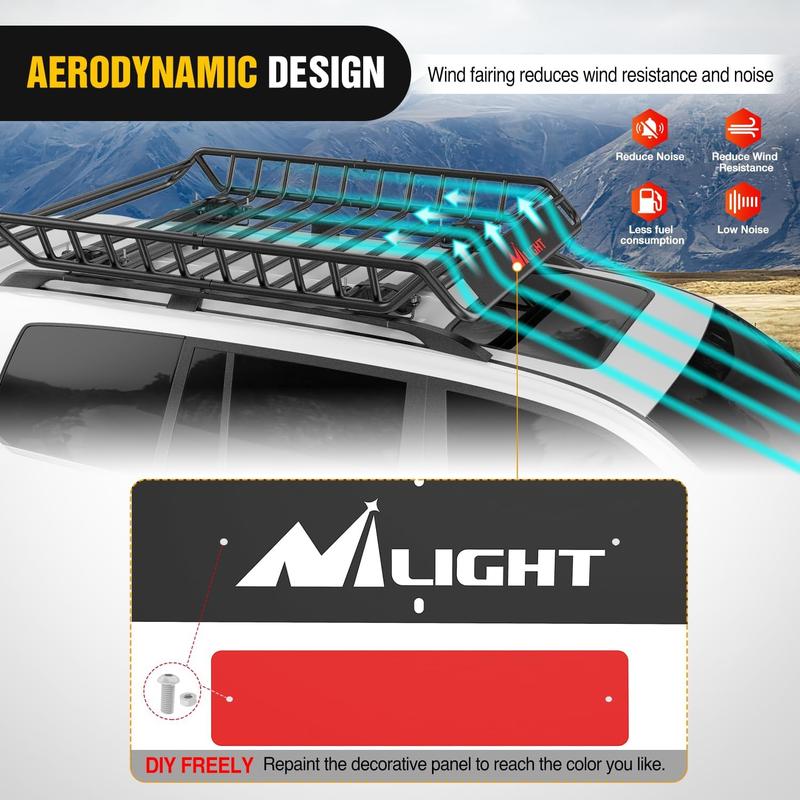 ·【AERODYNAMIC DESIGN】- The front of the roof cargo rack is equipped with a wind fairing to reduce resistance and wind noise. The cargo basket is designed with a curved corner to avoid scratches and accidental injuries when loading and unloading cargo.