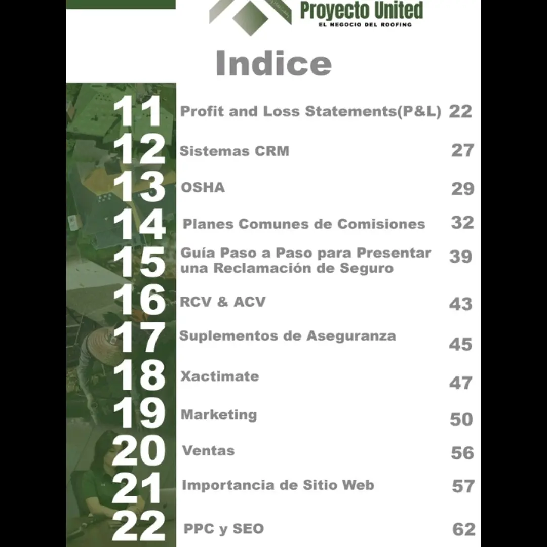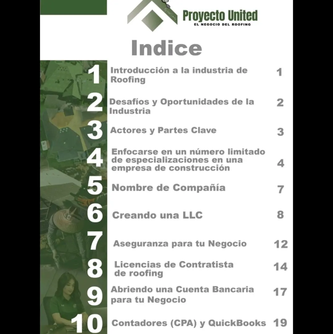Proyecto United tiene disponible ala venta un libro que puede ayudar a establecer o mejorar el proceso de una compañía de "ROOFING". Este libro bilingüe, con la primera mitad en español y la segunda en inglés, puede aclarar algunas dudas sobre la industria y ayudar a establecer la compañía de "ROOFING".
