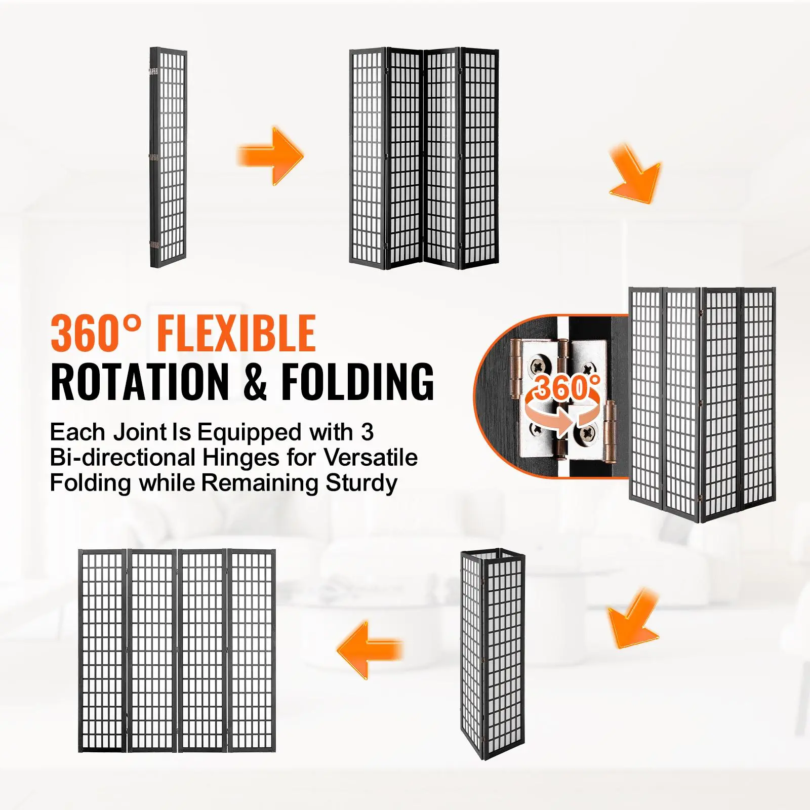 • 360° Rotating and Folding: Each room divider panel connects with three flexible bidirectional hinges, allowing you to rotate it 360° and fold it in any direction. This design ensures stability while you use it. When you're not using this room divider, simply fold it up and tuck it away in a corner - no clutter, just convenience. Set it up in a zigzag for added support and to avoid tipping.