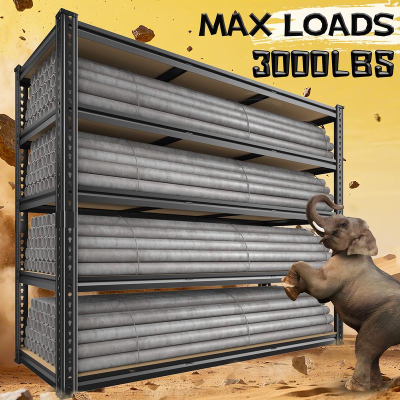 【3000 lbs Industrial Grade Storage Shelves Heavy Duty】 The RoomFave Garage Shelving features curved-edge reinforced metal uprights and 5mm thickened panels. Each sheves is equipped with reinforced support ribs on the back for enhanced structural stability and load-bearing capacity. Constructed from premium metal framing + wood panels, each shelf holds up to 600 lbs, with a total capacity of 3000 lbs. This industrial grade metal shelving unit delivers exceptional stability and durability, effortlessly accommodating more items.