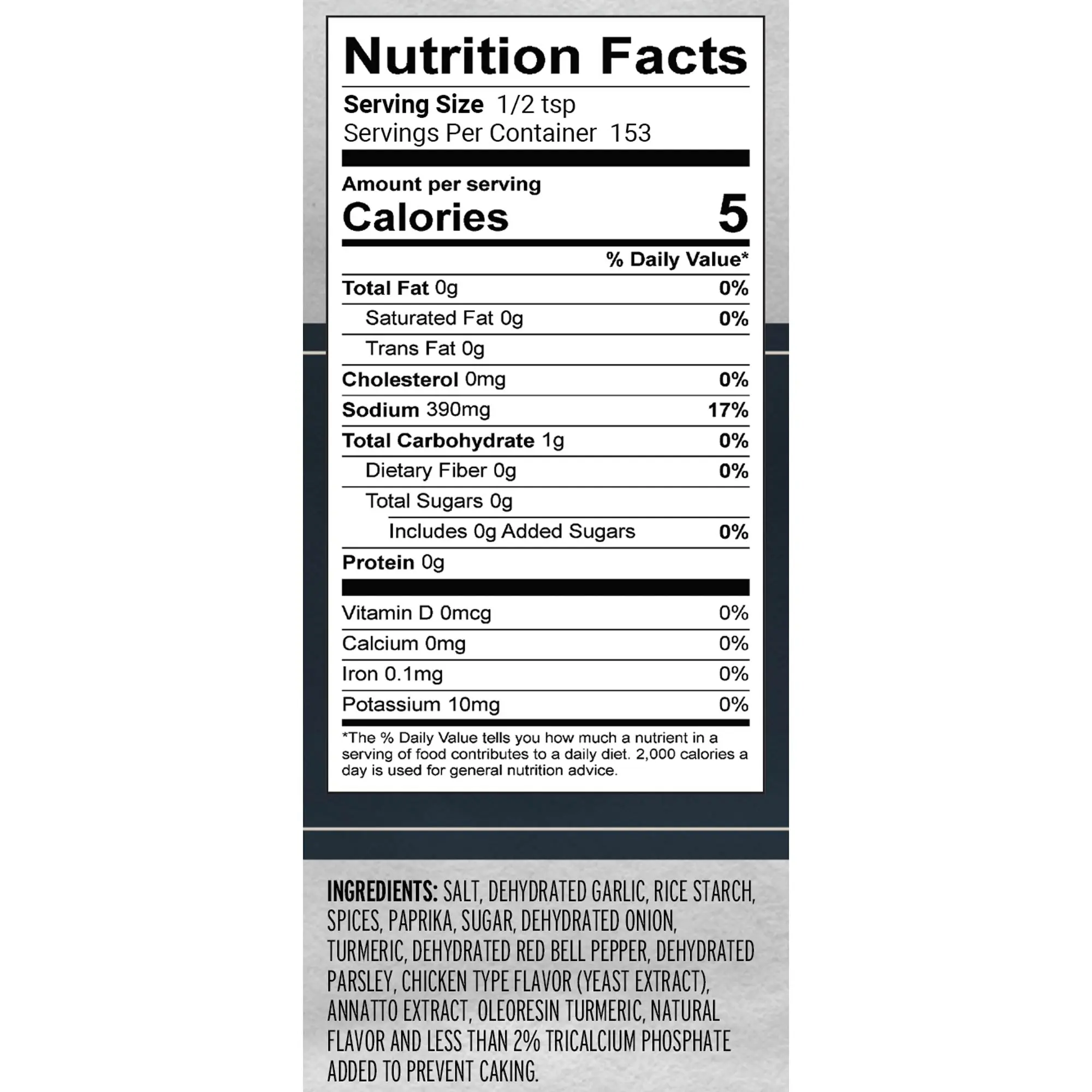 IngredientsSalt,Dehydrated Garlic,Rice Starch,Spices,Paprika,Sugar,Dehydrated Onion,Tumeric,Dehydrated Red Bell Pepper,Dehydrated Parsley,Chicken Type Flavor (Yeast Extract),Annatto Extract,Oleoresin tumeric,Natural Flavors,Less than 2% Tricalcium Phosphate