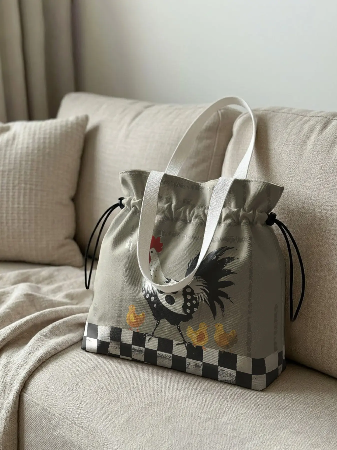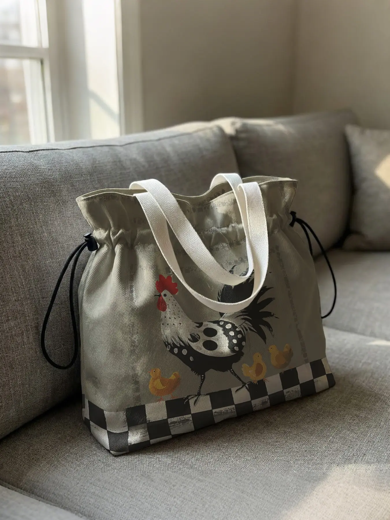 Rooster Pattern 2D Printed Drawstring Stylish Tote Bag, Large Capacity Shopping Bag, Durable and Wear-Resistant, Ideal for Work, Shopping, Picnic