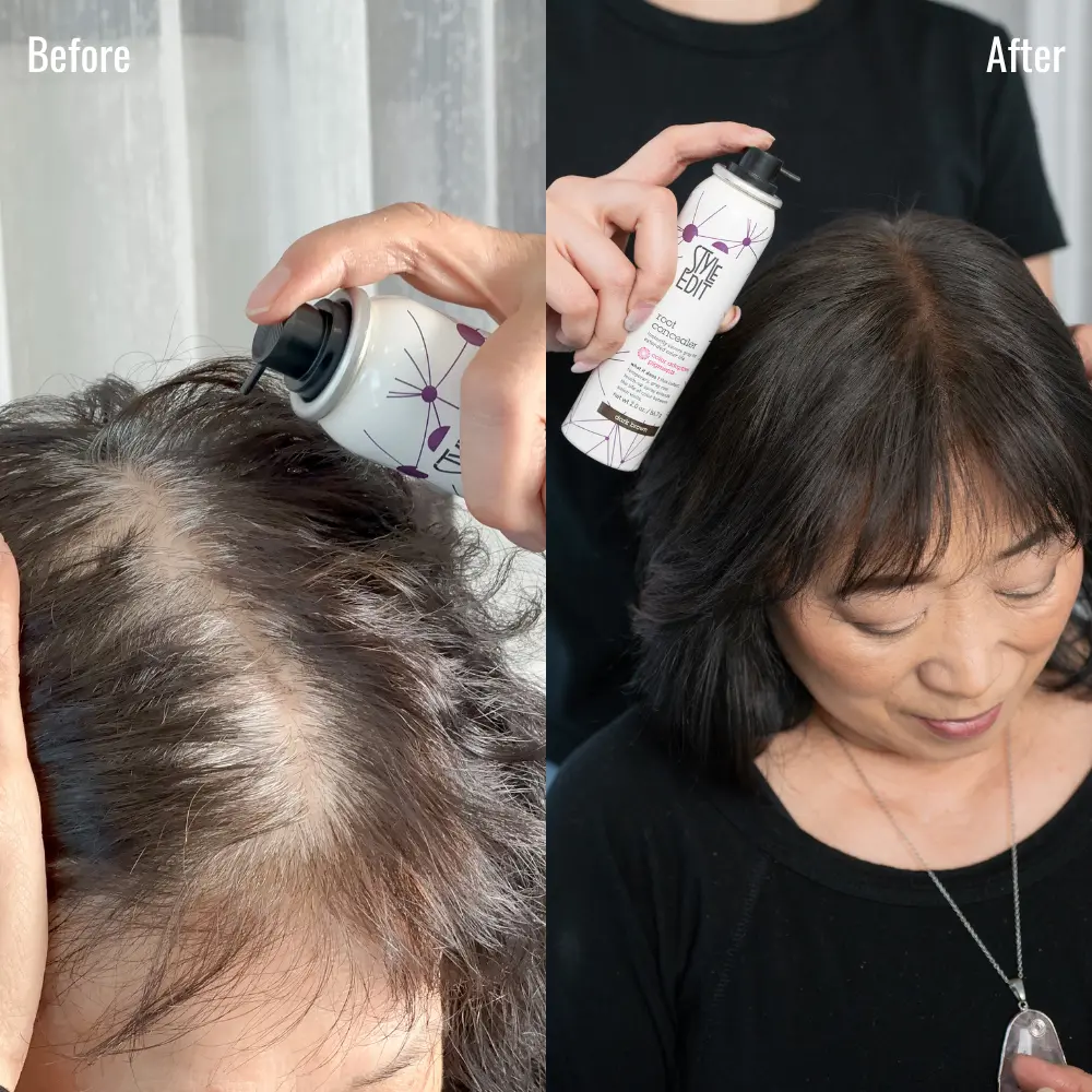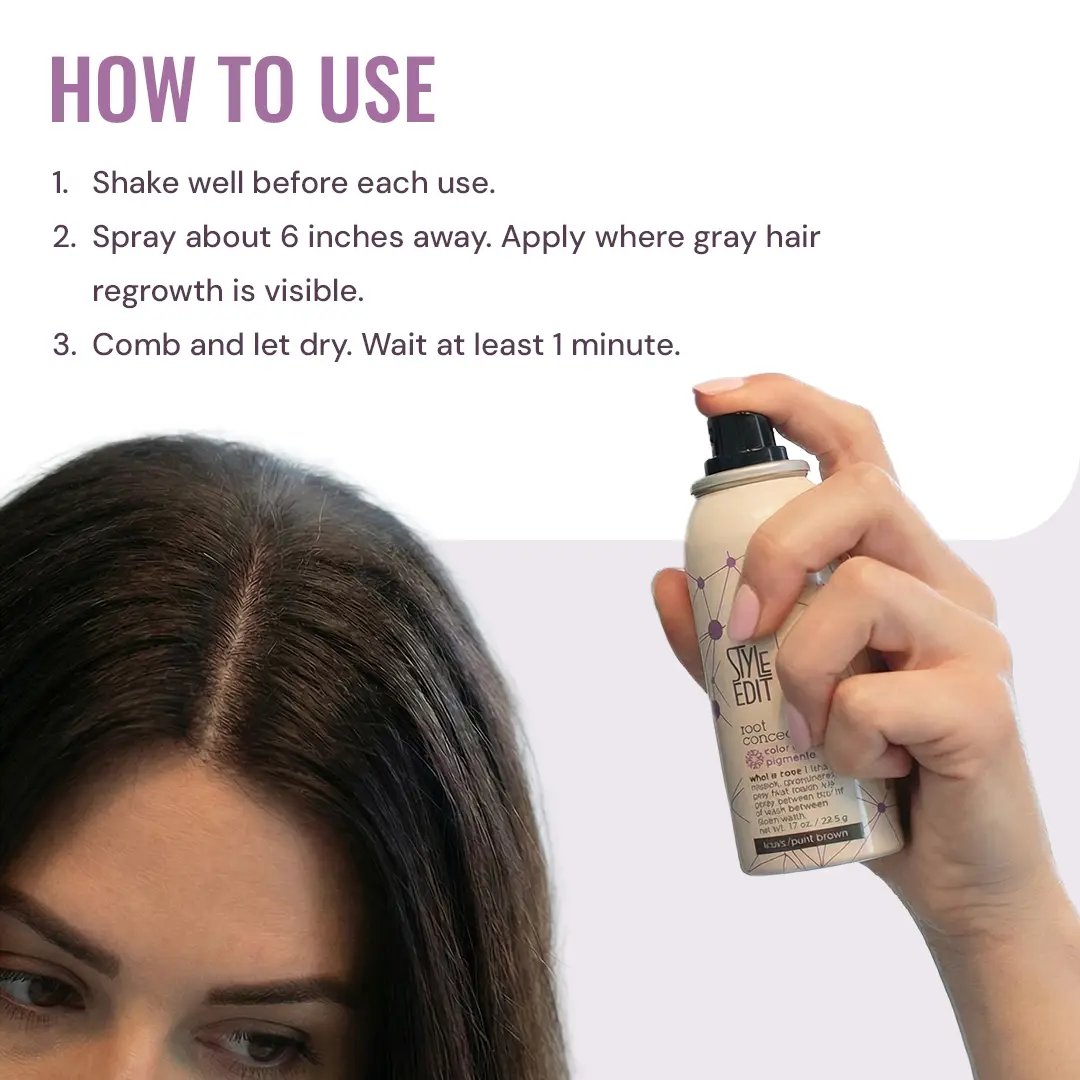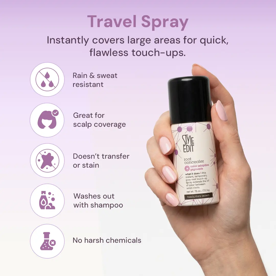 The Style Edit TRAVEL SIZE Root Concealer Spray delivers the ultimate on-the-go solution for covering gray roots and regrowth. Featuring our lightweight, binding Root Touch-Up Spray this root concealer targets visible grays, root regrowth, and thinning areas with seamless, blendable color. The spray uses color-adaptive pigments to seamlessly blend into larger areas with a lightweight, rain- and sweat-resistant formula. Whether you're traveling, in a rush, or simply need a quick fix, this root concealer spray offers versatile, professional-quality gray coverage that washes out easily with shampoo. Style Edit’s hair color products are free of parabens and silicones, proudly made in the USA, and trusted by salon pros for flawless results at home or on the go.