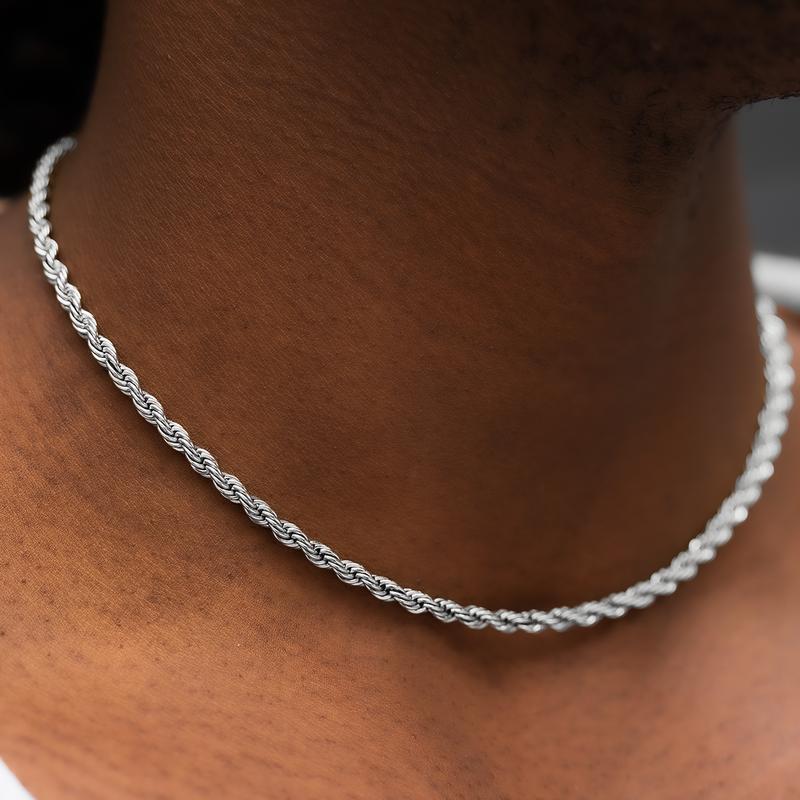 The Rope Chain (4mm) is a timeless staple that belongs in every jewelry collection. Crafted in 18k White Gold plating, its twisted rope design catches the light from every angle for subtle yet noticeable shine.