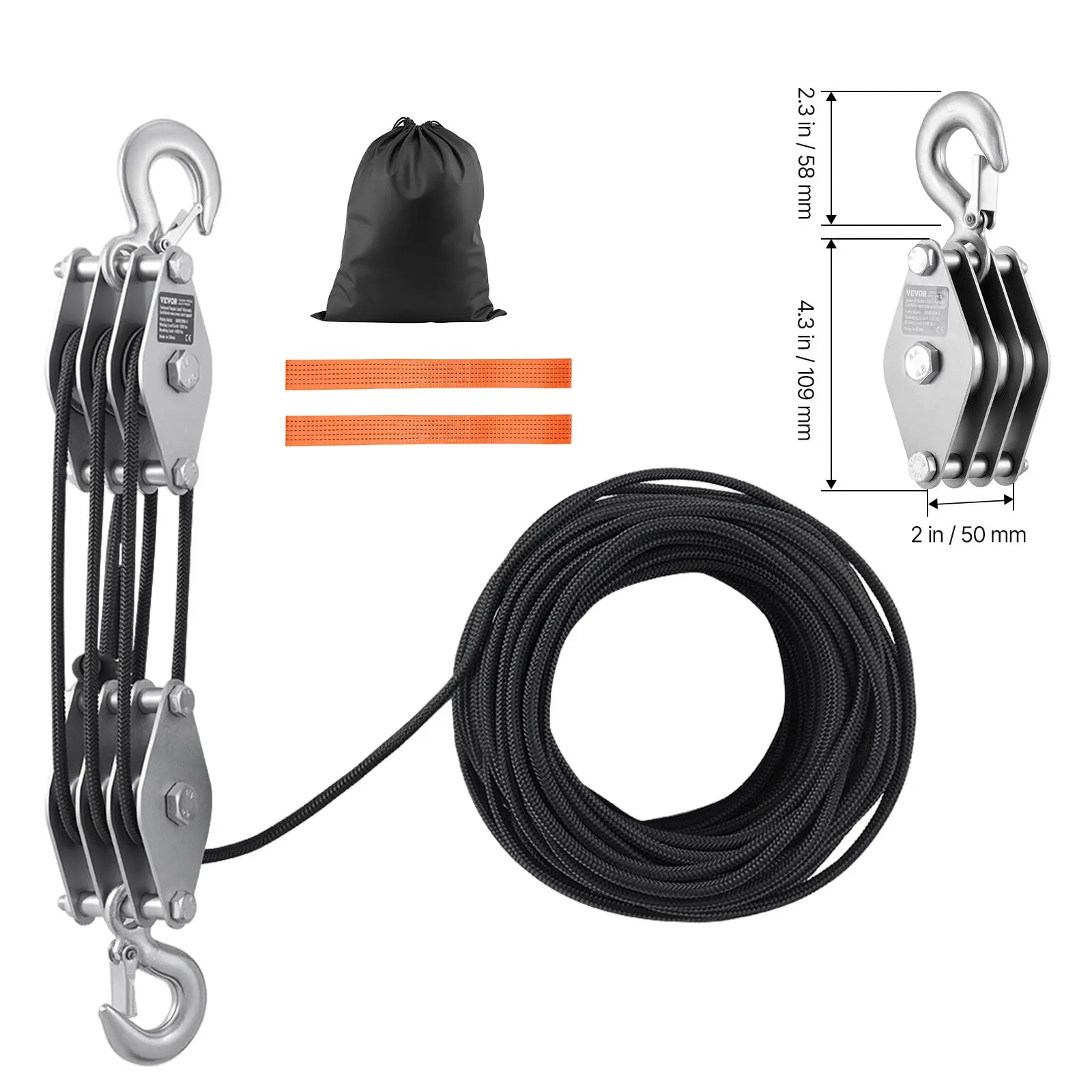 5. VEVOR 4400 lbs Breaking Strength 100 FT Rope Pulley Hoist, 5:1 Lifting Power Heavy Duty Pulley System with 2pcs Soft Loops, Metal Wheels Bearing Structure, Block and Tackle for Lifting Heavy Objects