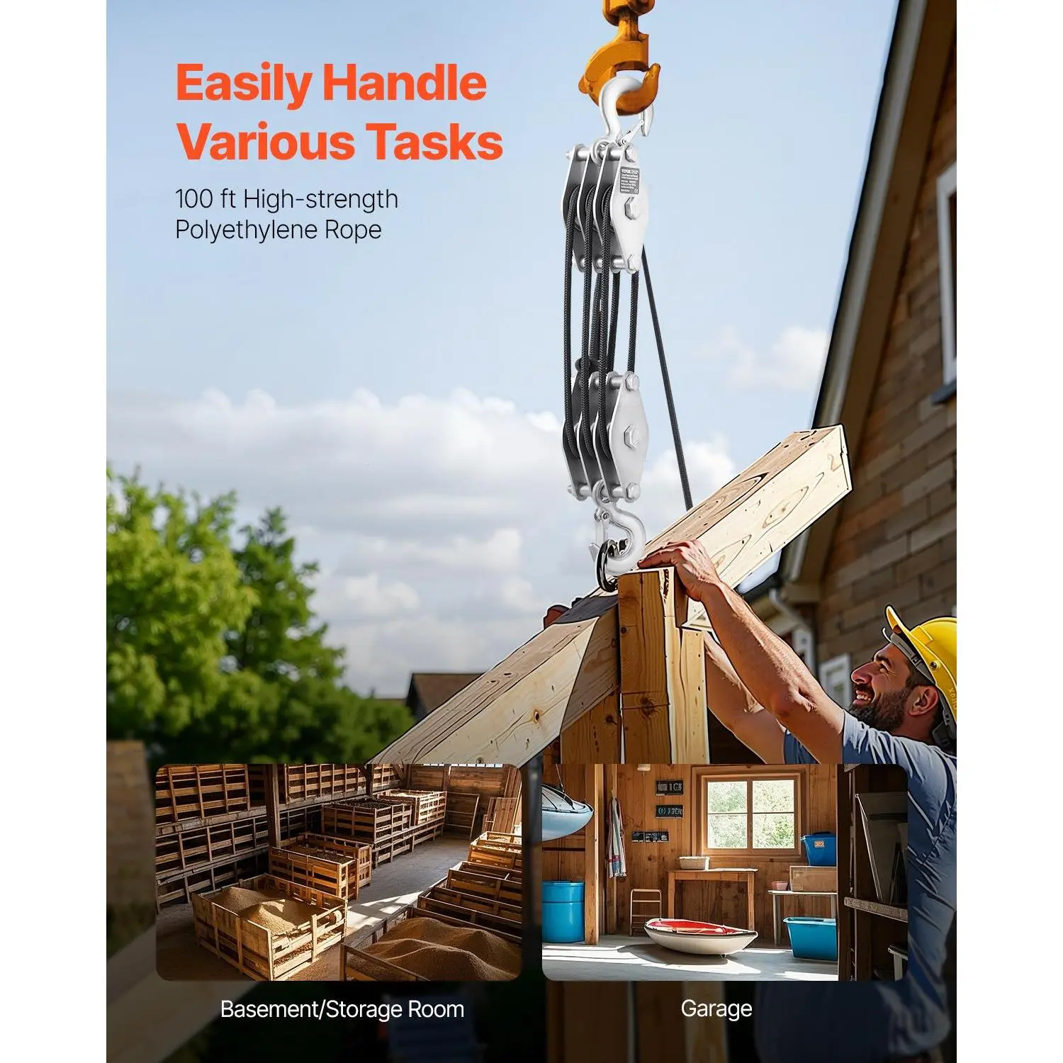 • Durable Steel Construction: Built tough, this pulley lift system uses high-strength galvanized steel for the housing and pulleys, with a rust-resistant finish to withstand heavy use. The forged locking hooks add extra durability, while the reinforced side panels avoid any twisting or bending. Trust this hoist to be your reliable partner for all lifting needs.