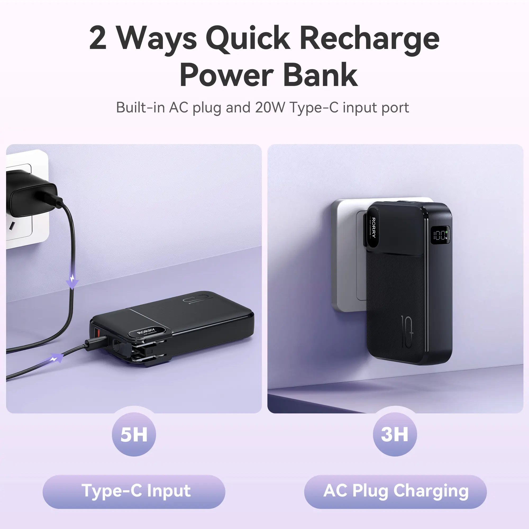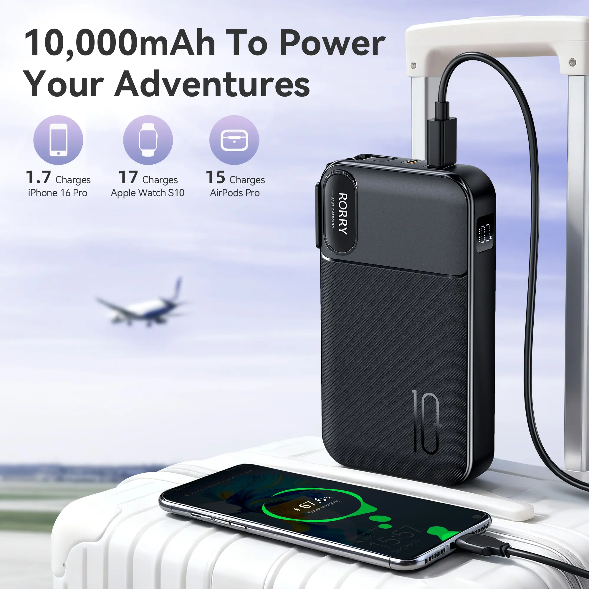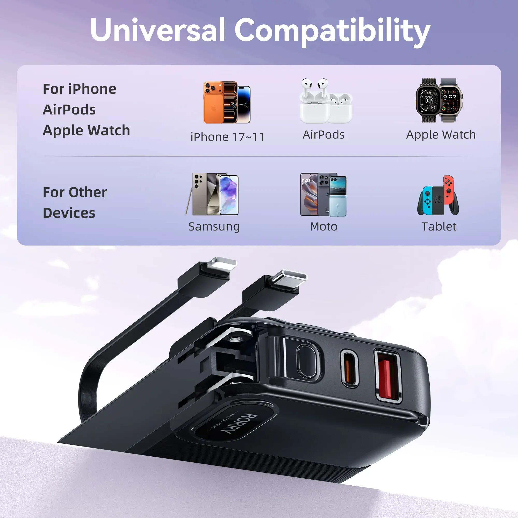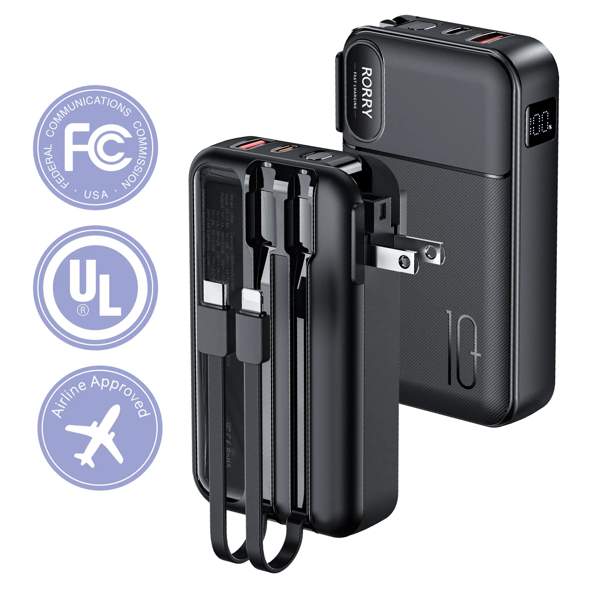 The RORRY 10000mAh Portable Charger with Built-in Cables & AC Wall Plug is a versatile and reliable power solution for charging your mobile devices on the go. With its integrated socket design, built-in foldable AC plug, and high-power output, it ensures convenient and efficient charging.