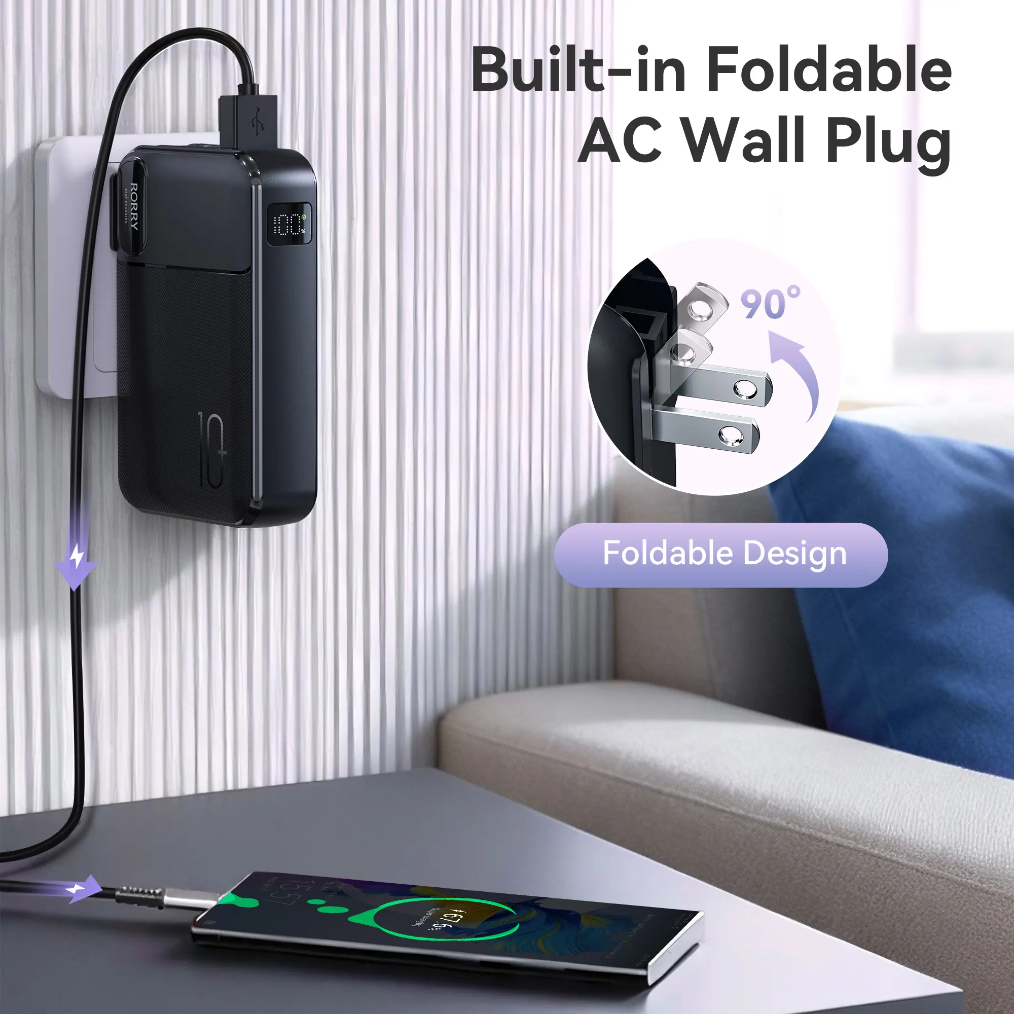 ·Built-in Foldable AC Plug: No need to carry additional cables or chargers, plug directly into an outlet for instant charging.