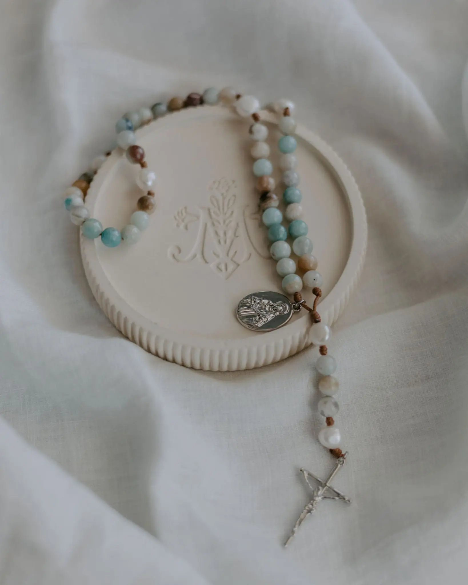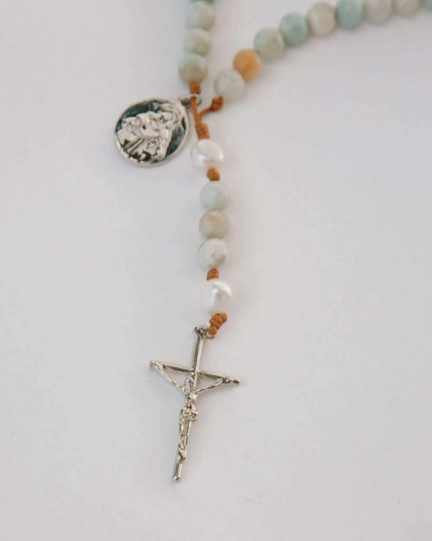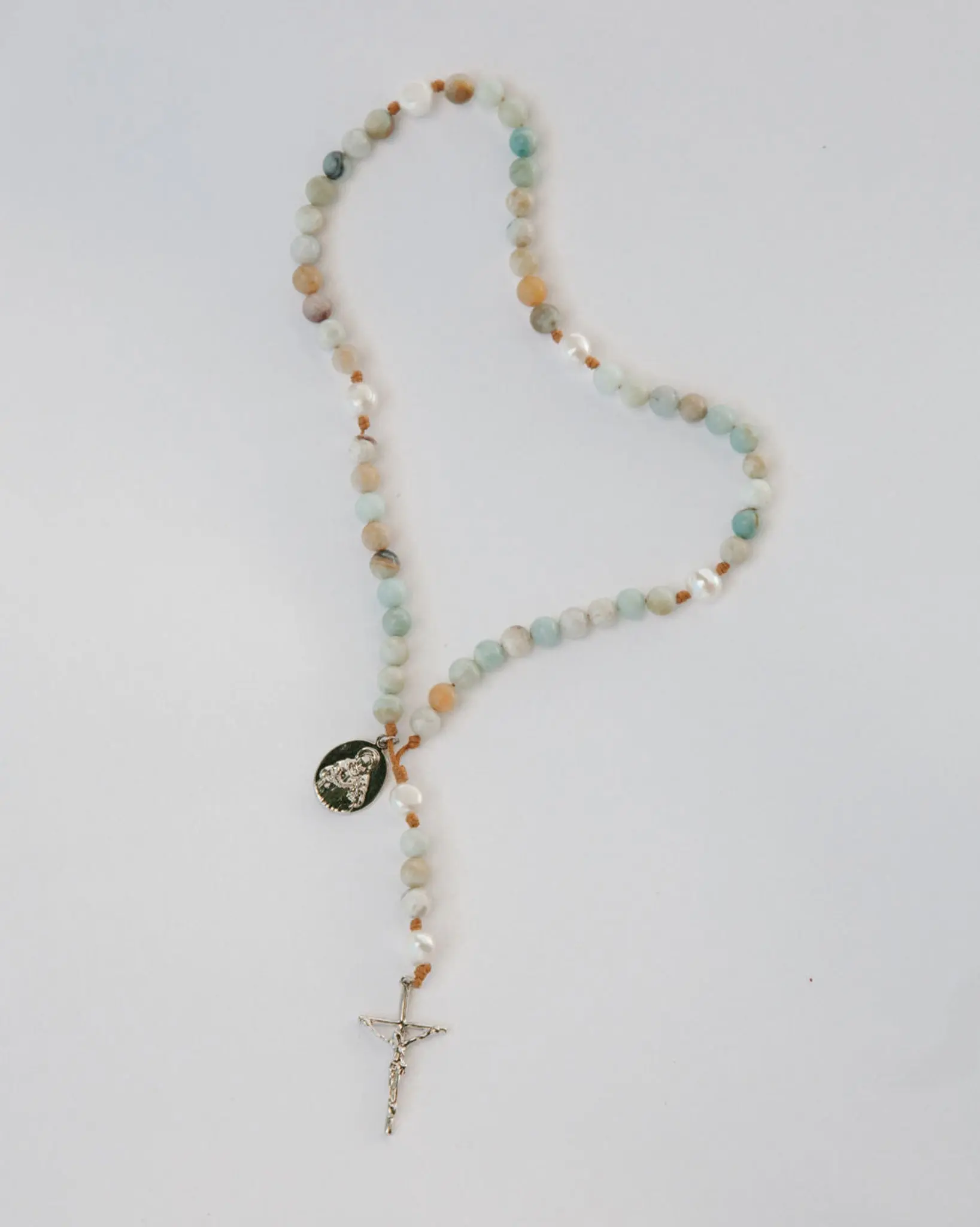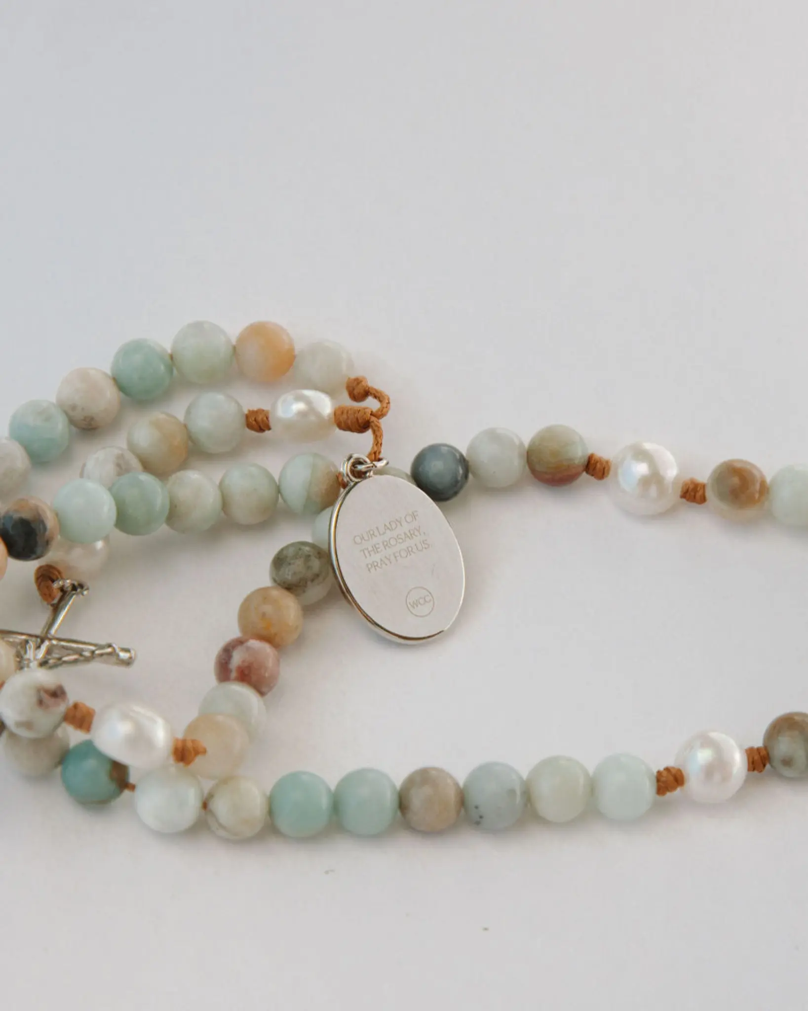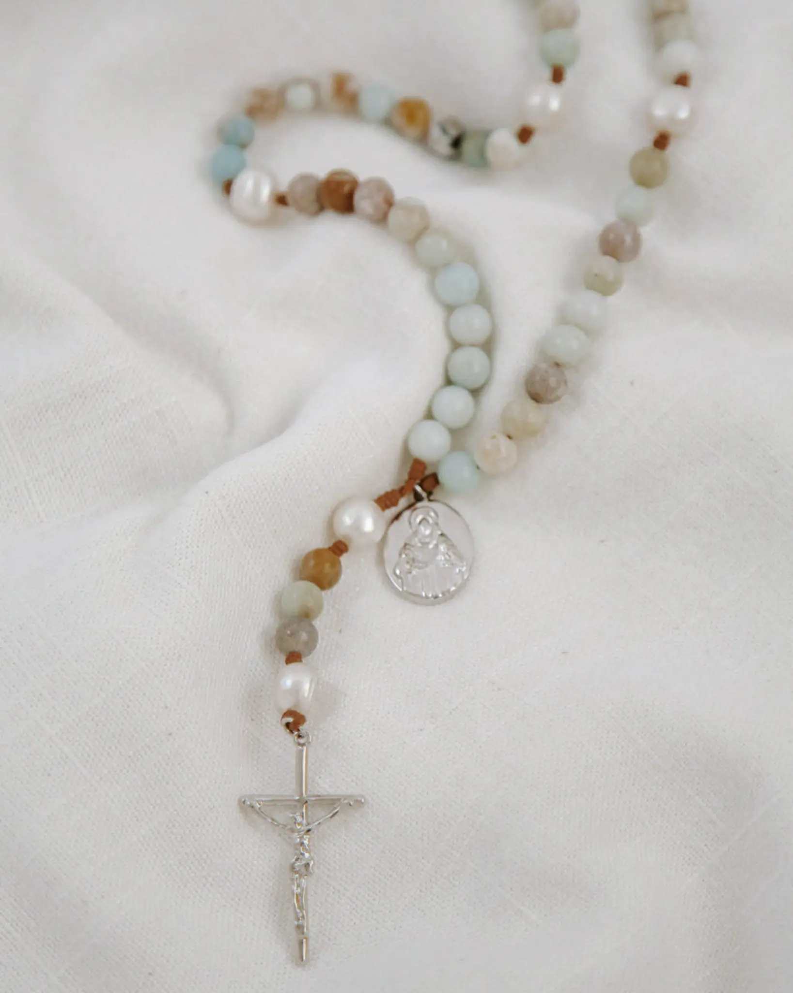 Beautifully hand crafted, each bead is a different shade from each other which makes this rosary unique. . . I like to think that the different shades represent the color of the water from the Sea of Galilee.