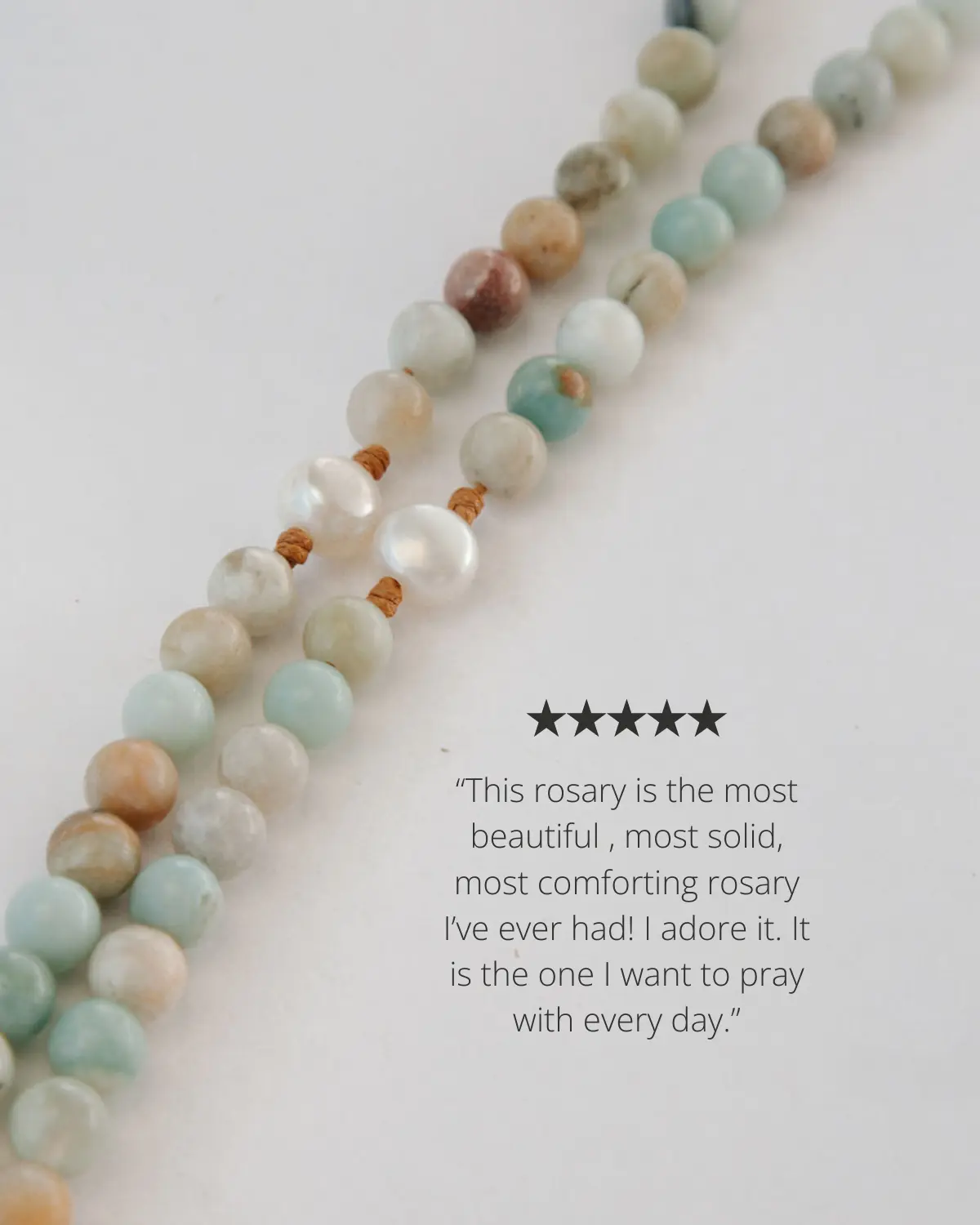 This rosary is so beautiful and successfully makes you think of the sea. 🥹 I personally prefer the rosaries with the mini gold beads in between each Hail Mary bead so it’s more flexible. 5 🌟 because that’s just a preference.