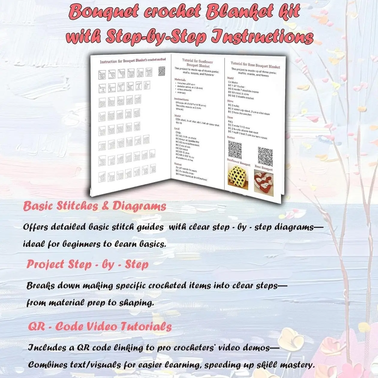 · What You Get: This crochet blanket kit for beginners adults has everything you need to learn to crochet rose bouquet blanket. Crochet hooks set includes: 3.0mm soft handle crochet hooks,10 skeins of crochet yarn, 6 plastic stitching needles,10 stitch markers,1 detailed instructions.Rose bouquet blanket kit for beginners adults.