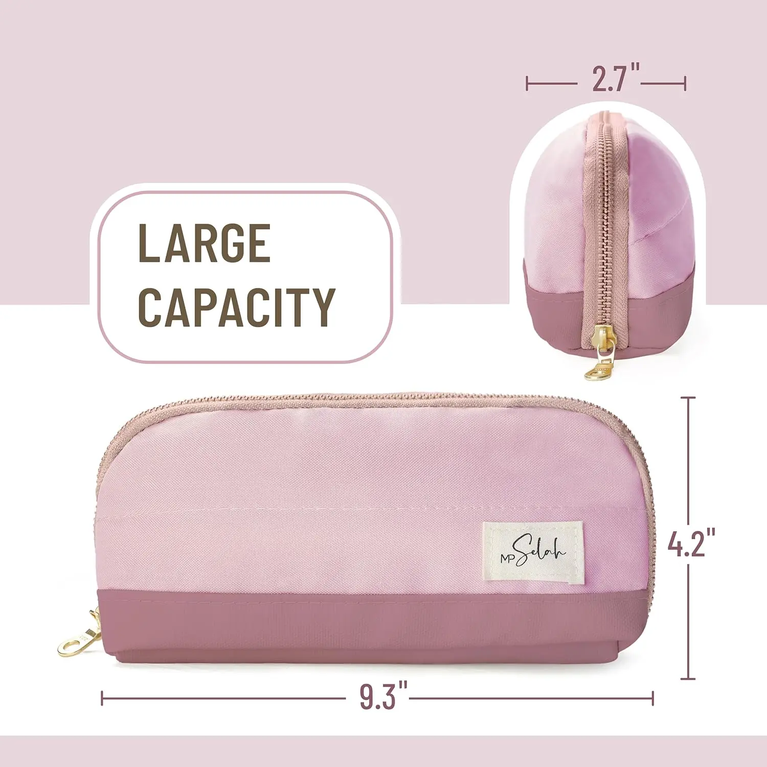 This pencil pouch is a great size for my needs and I love the compartments inside for storing sticky notes, clips and whatnots. The two-tone pink is fun and helps me find it easily in a bag. Zipper works as it should, no pulling. The label on the front was sewn on crooked and the stitching is off-centered, too, so that's unfortunate. But for the price point, it's fine. It would've been nice if it was at least straight.