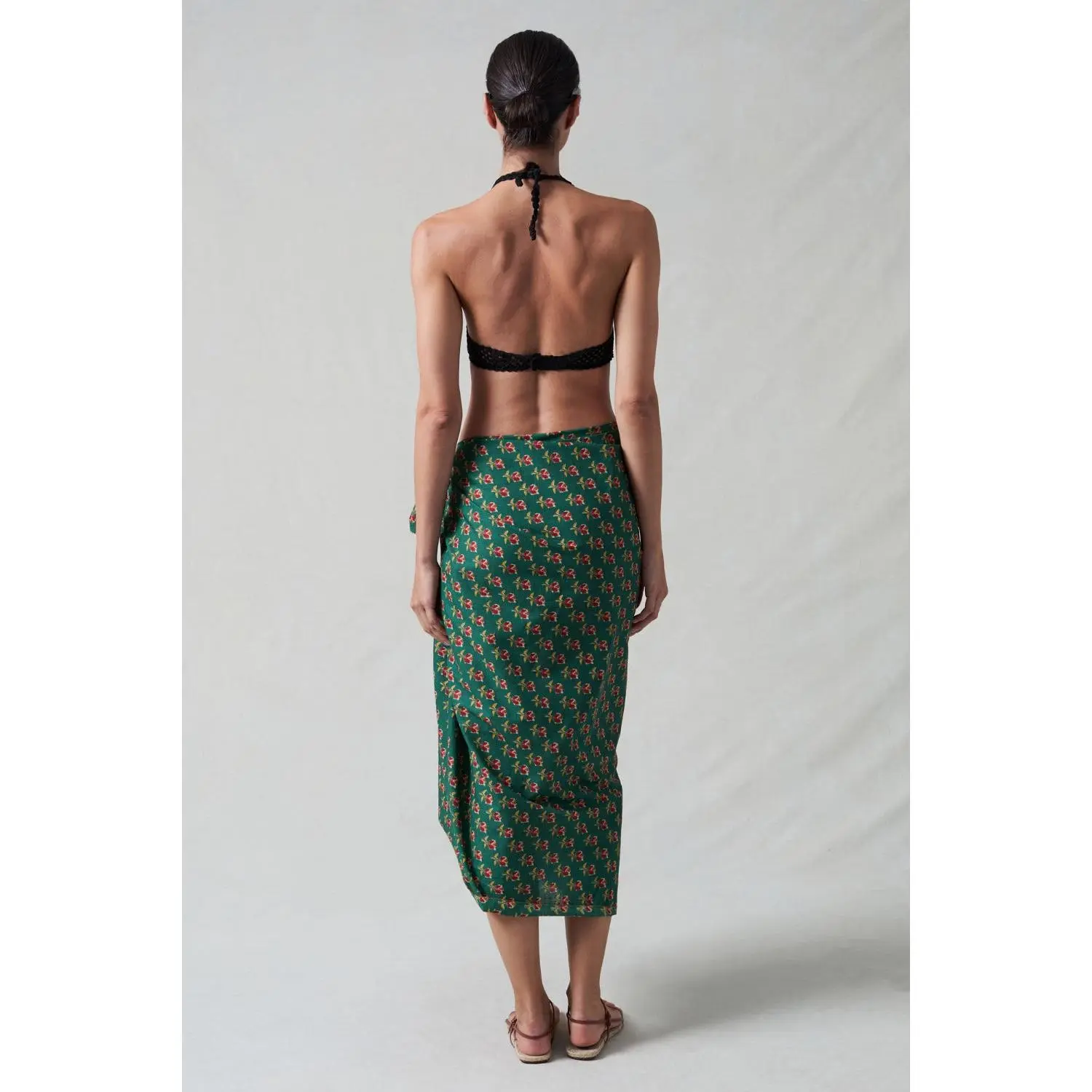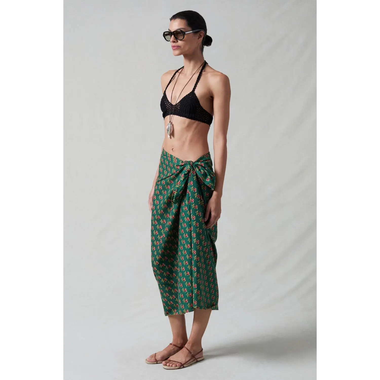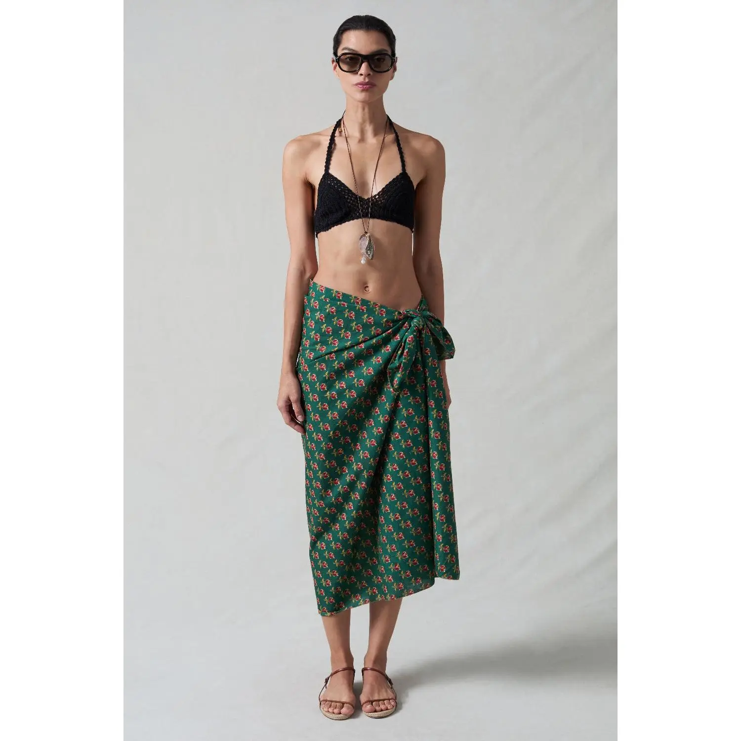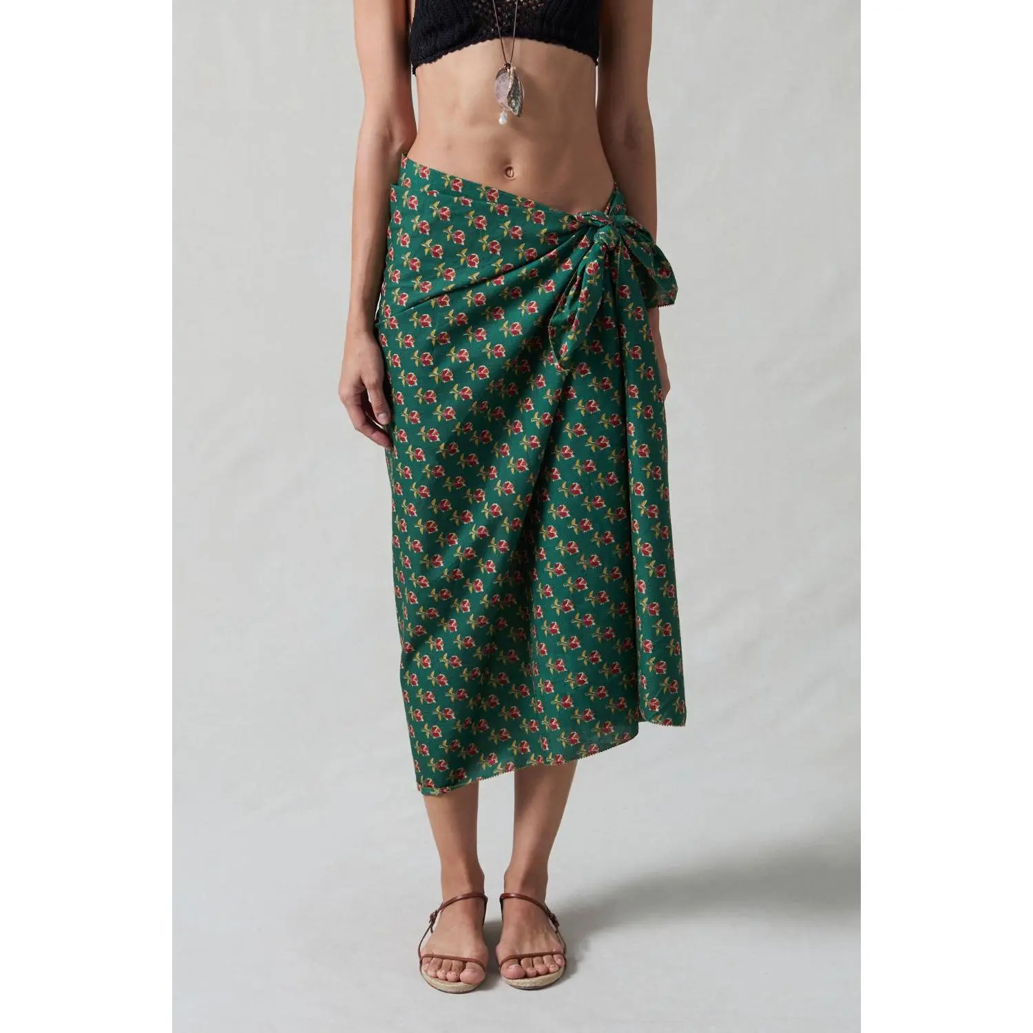 Our Rose Printed Sarong features a floral block print against a teal green background. Tie it at the hip for an easy coverup at the beach or by the pool.
