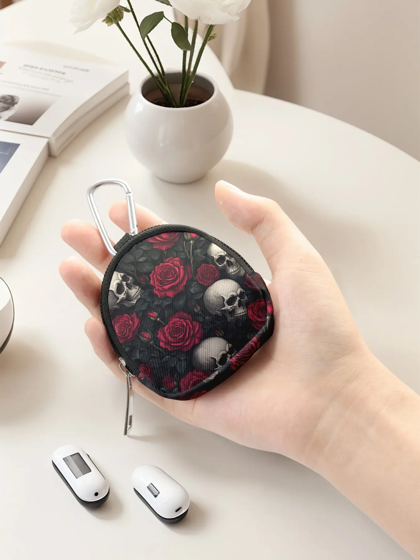Rose Skull Pattern Mini Wallet, Lightweight Zipper Coin Purse with Hook Clip, Earphone Key Bag, Unisex Casual Style, All Seasons