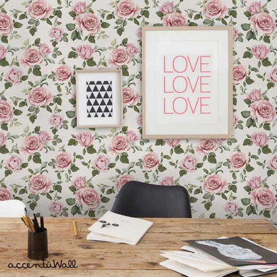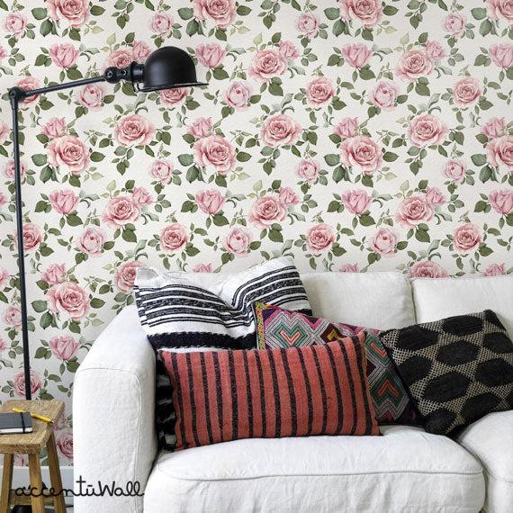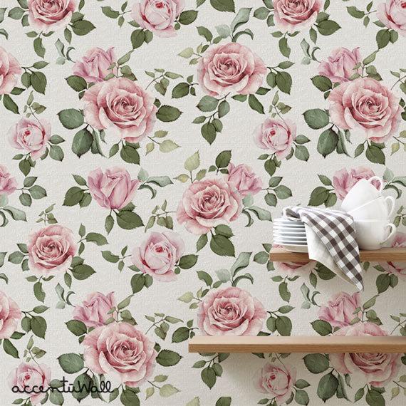 Rose peel & stick wallpaper. The designs are printed onto an adhesive backed material that can be removed, repositioned and reused over and over again. They do not leave any residue on your walls and are ideal for DIY room makeovers without the mess and headaches of traditional wallpaper.