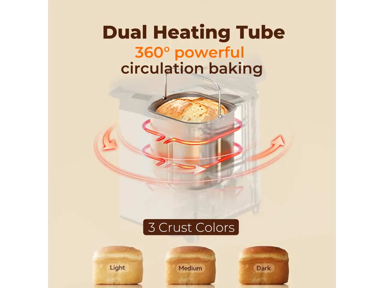 ·360° Dual Heating for Even Baking: Top and bottom 700W heaters provide fast, surround baking that intelligently adjusts for fluffy and evenly baked bread in less time.