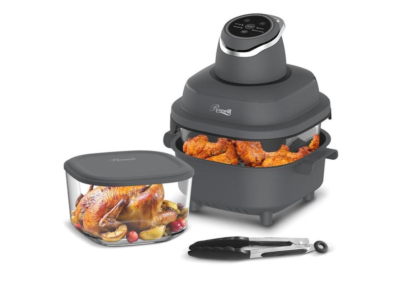 5. Rosewill 4-in-1 Portable Glass Air Fryer, 4.7QT Transparent Glass Cooking Pot with Storage Lid & Tongs, Compact Smart for Deep Roast, Recrisp, Keep Warm – Dark Grey