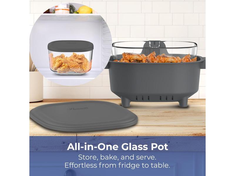 Rosewill 4-in-1 Portable Glass Air Fryer, 4.7QT Transparent Glass Cooking Pot with Storage Lid & Tongs, Compact Smart for Deep Roast, Recrisp, Keep Warm – Dark Grey