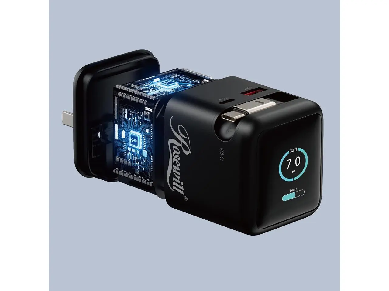 5. Rosewill 70W Retractable USB-C Wall Charger with Built-in Cable, 3-Port GaN 3 Fast Charging, Foldable Design & Real-Time TFT Display for MacBook, iPad, iPhone, Galaxy - Black