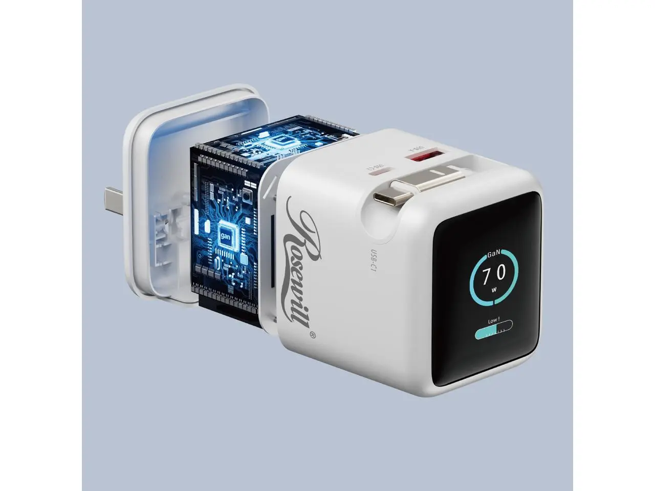 5. Rosewill 70W Retractable USB-C Wall Charger with Built-in Cable, 3-Port GaN 3 Fast Charging, Foldable Design & Real-Time TFT Display for MacBook, iPad, iPhone, Galaxy - White