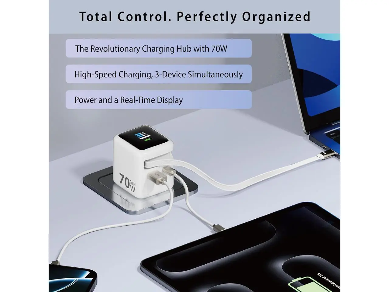 Rosewill 70W Retractable USB-C Wall Charger with Built-in Cable, 3-Port GaN 3 Fast Charging, Foldable Design & Real-Time TFT Display for MacBook, iPad, iPhone, Galaxy - White