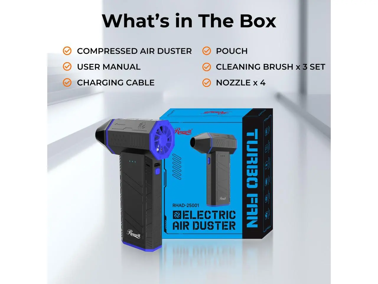 Rosewill Electric Air Duster-110,000 RPM Super Power Cordless Compressed Air Duster, 3-Gear Adjustable Mini Blower with Fast Charging, Dust Blower for Computer, Keyboard, Pet, House, Outdoor and Car