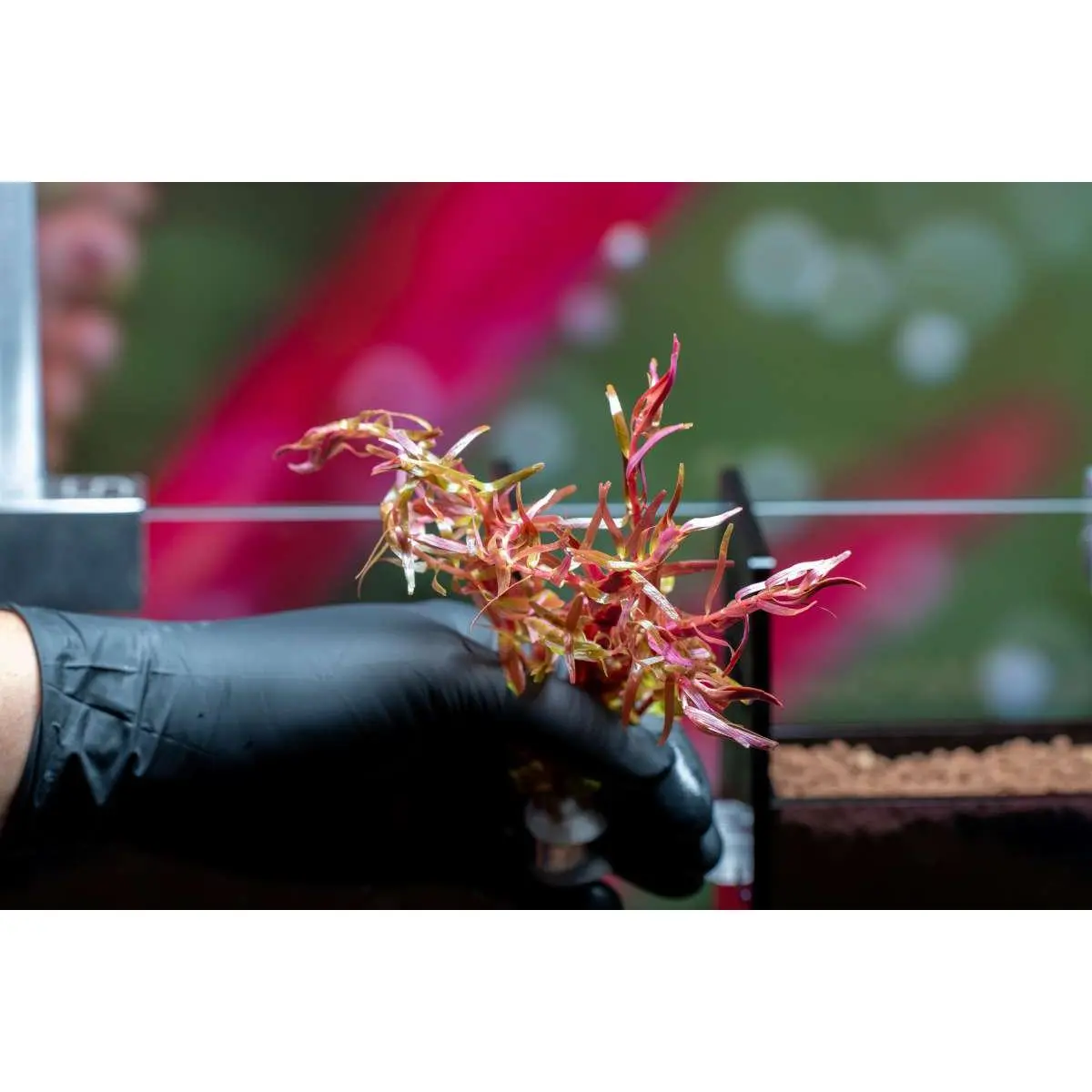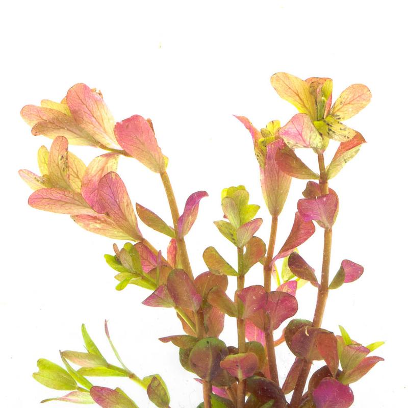 Arrived a bit tattered on the tips, but has quickly recovered in the aquarium. The pinks of the leaves really add a nice splash of color against green plants and dark substrate.