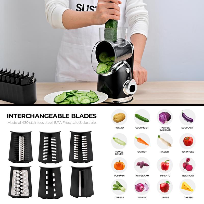 ·Equipped with 5/6 replaceable blades, no need for any cutting skills, just turn the handle a few times, whether sliced or shredded, thick shredded, even wavy, it can be easily handled, quickly prepare food, such as cheese, potatoes, zucchini , Carrot, Cucumber, Chocolate.