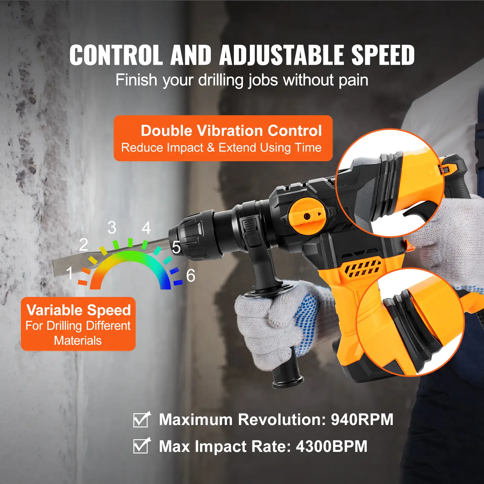 • Adjustable Speed & Vibration Control: The hammer drill for concrete is equipped with a speed control system; You can change the speed from 1 to 6 according to your needs. It can reach 940prm no-load speed and 4300bpm max impact frequency. In addition, the double vibration control design effectively reduces injury during work. Pound away at the ground and break through any challenges with ease!