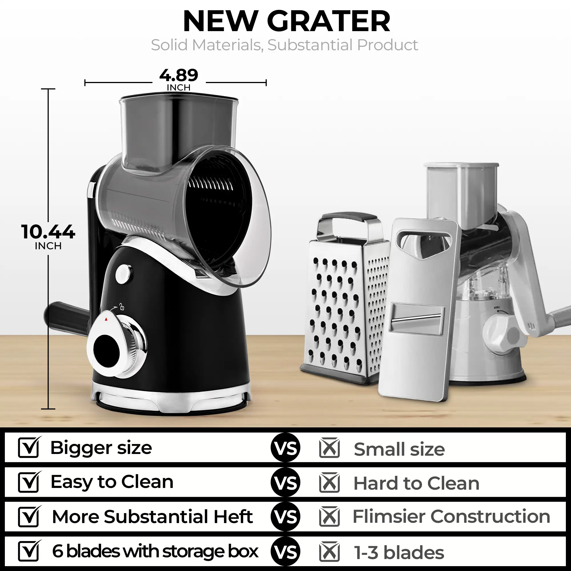 ·【Innovative & Safe Design】: This rotary cheese grater has a built-in powerful suction base, which can be fixed on a clean or smooth countertop to ensure stability during use. Fingers and palms do not touch the blades, eliminating dangerous operation of the traditional cheese shredder. In addition, the mandoline slicer has a sloping curve that allows the grated ingredients to fall smoothly without clogging.