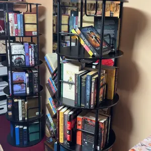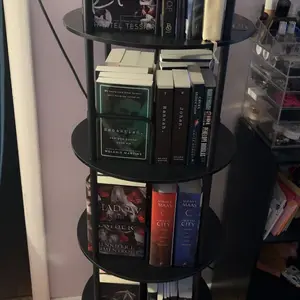 just put everything on it and it holds a lot of stuff, the spin on it is quite convenient i think it takes up a little less space than a regular looking bookshelf