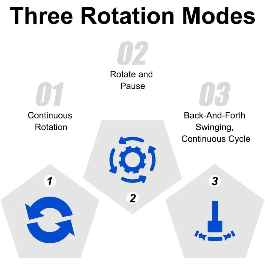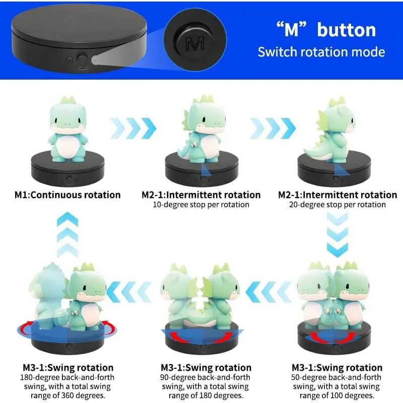【Mode Switching with M Key】: The M key on the side of the rotating display stand allows for six different rotation modes. Pressing the M key six times cycles through these modes in sequence: M1: Continuous rotation mode;M2: Intermittent rotation mode (stops every turn); 10 degrees per stop mode;M3: 20 degrees per stop mode;M4: Pendulum swing mode; swings 50 degrees, total swing range ±50 degrees, 100 degrees in total; M5: Swings 90 degrees, total swing range 180 degrees; M6:Swings 180 degrees, total swing range 360 degrees.