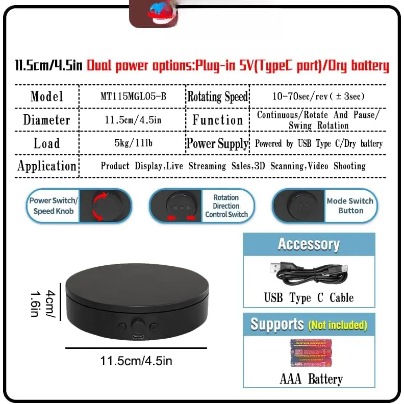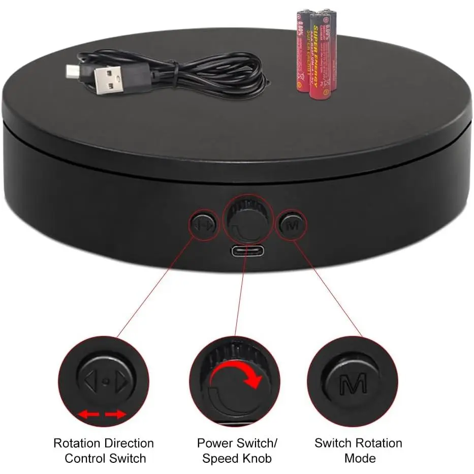 【Power Options】: The photography turntable can be via Type-C connection, 3 AAA (not included), . Type-C power can connect to a computer or power , offering flexible power choices. Type-C power is suitable for indoor use, while can be in outdoor or power-limited environments. When a power socket is unavailable, provide convenient mobility, making it suitable for exhibitions, outdoor activities, and various other scenarios.