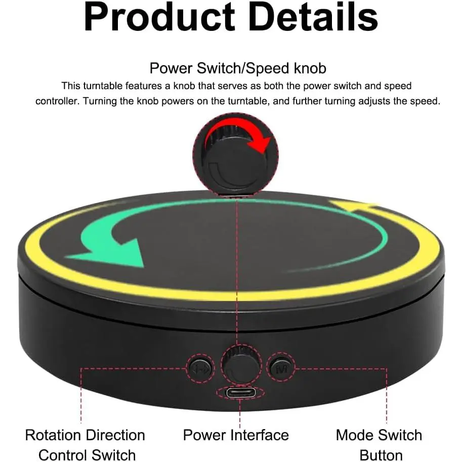 【Direction Control Button】: The arrow on the left side of the turntable controls the rotation direction. Easily change the rotation direction of the display stand with simple and intuitive operation, without needing complex settings.