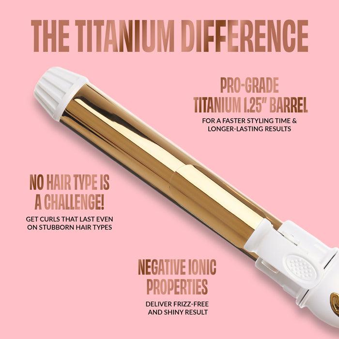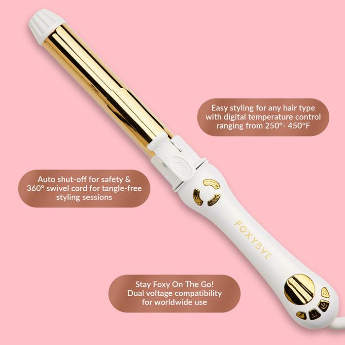 Say hello to the ultimate styling tool for flawless curls with the touch of a button! Our Twirl Boss Pearl Gold Titanium Rotating curler is crafted with a professional-grade 1.25" titanium barrel, delivering frizz-free, shiny and long-lasting beachy curls even on the most challenging hair types. The barrel auto rotates in both directions, allowing for varied curl patterns, while making curling your hair easier and faster than ever! Set the temperature to match your hair type with digital heat setting up to 450°F, and enjoy stress-free styling sessions with the 360° swivel cord and auto shut-off safety feature. Dual voltage compatibility ensures you can stay foxy on the go with gorgeous, long-lasting curls at the tap of a button!
