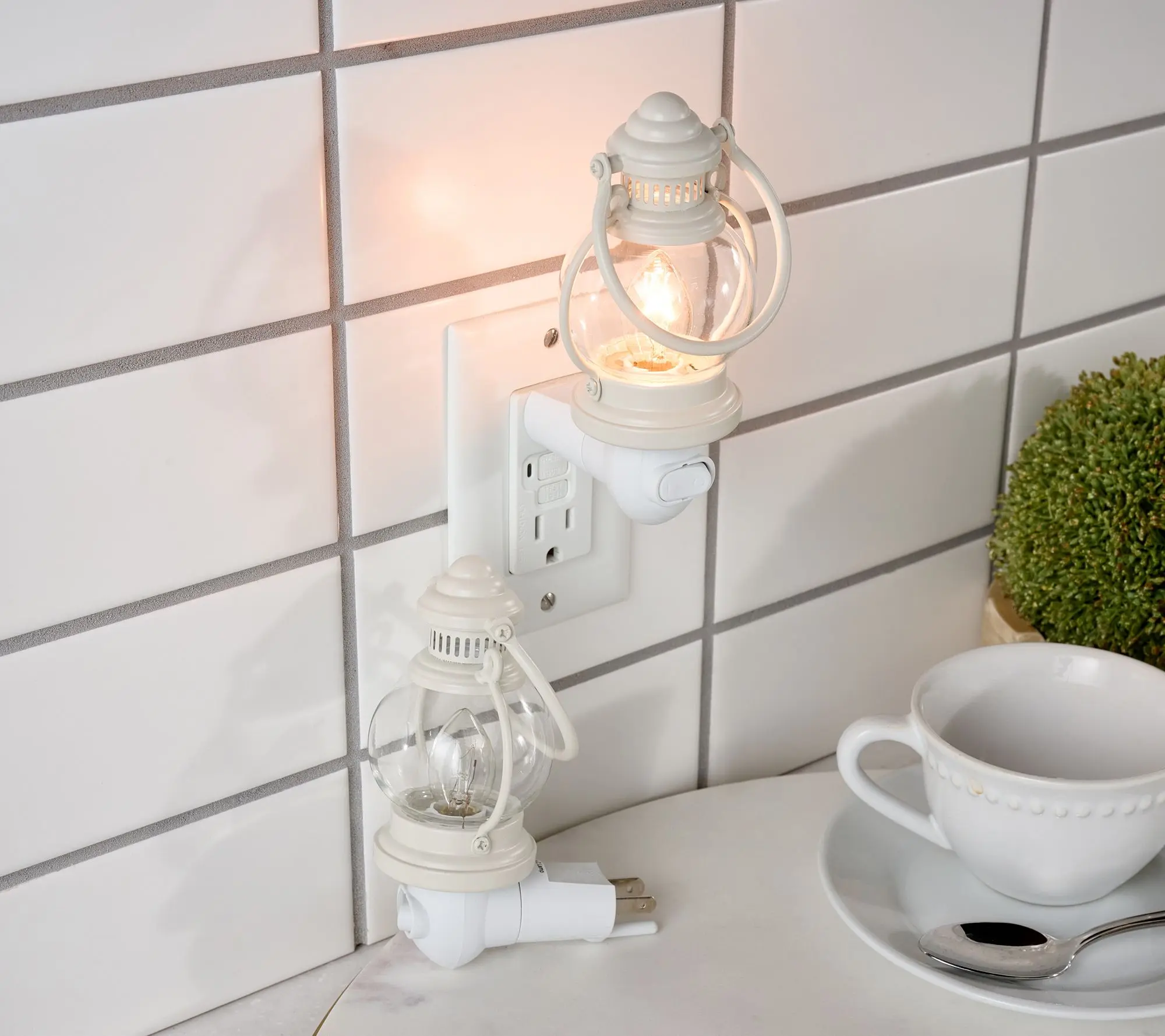 This Home Reflections S/2 Rotating Lantern Nightlights will be the perfect addition to your home. Comes in color choice of black, aged bronze, ivory, champagne, or red. Set measures approx. 4" x 3" x 5 3/4" and weighs under a pound. Item is ETL listed. Imported.