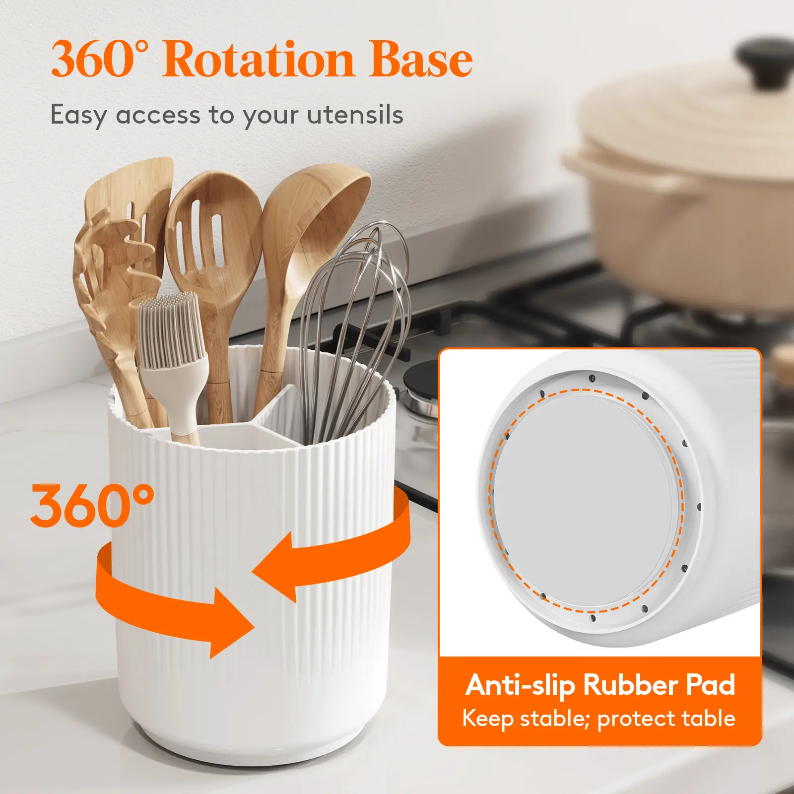 5. Utensil Holder for Kitchen Counter, Cooking Silverware Caddy with Non-Slip Rotating Base, Large 3 Compartment Plastic Spoon Spatula
