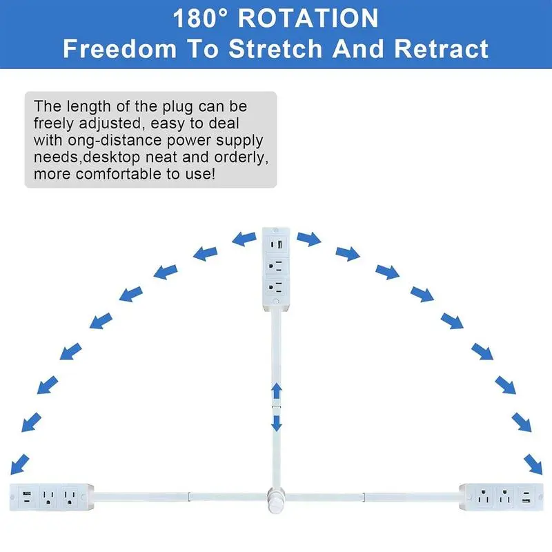 Adjustable & Rotatable Design: Extendable arm (22"-34") with 180° rotating base. Reach behind furniture effortlessly—couches, nightstands, desks—with vertical, horizontal, or angled placement. Perfect for tight spaces and awkward outlets 1 All-in-One Charging Hub: Dual AC outlets + USB-A/USB-C ports.