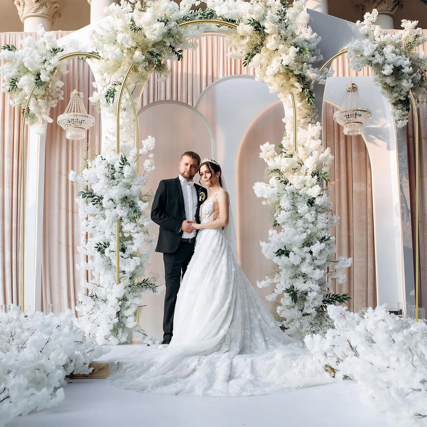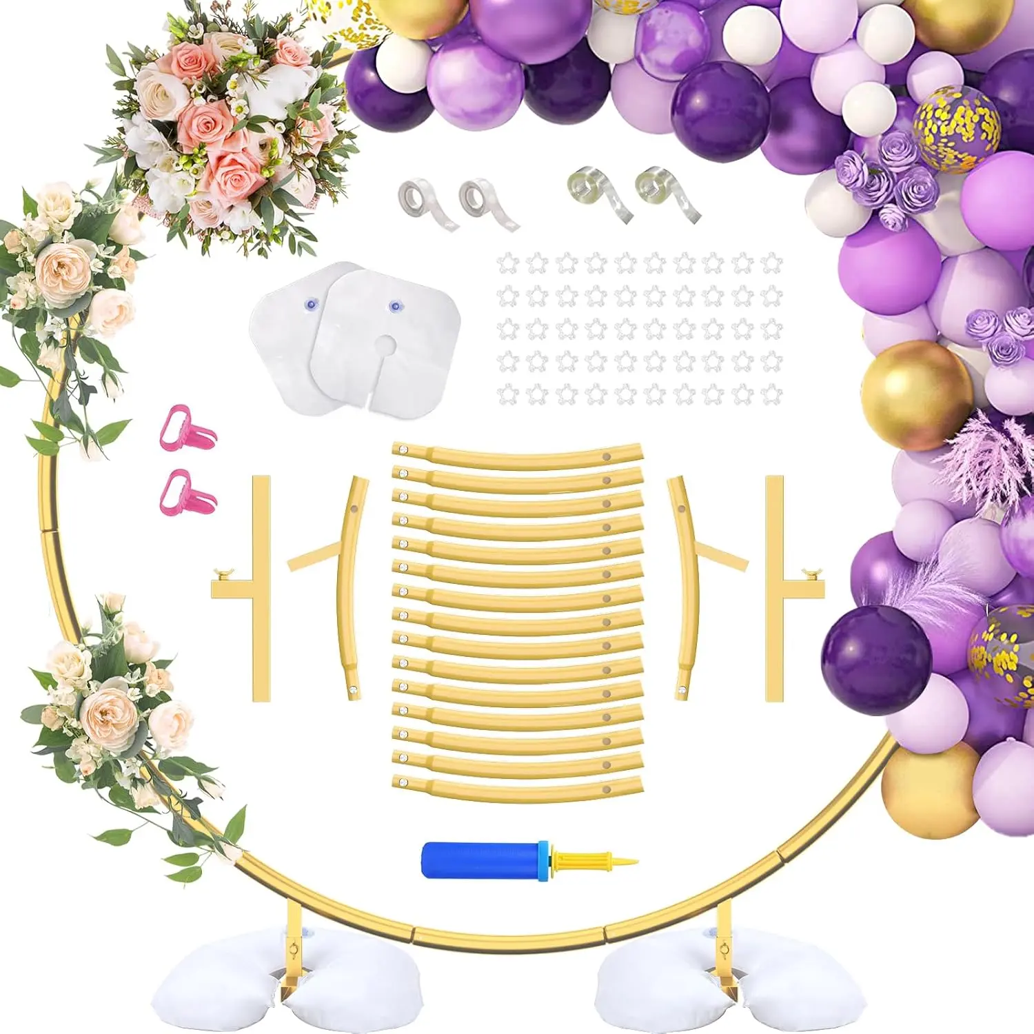 ·Package Including: Round backdrop stand balloon arch kit including circle backdrop stand x 1, water bags x 2, flower clip x 50, balloon dots glue x 2, balloon knotter x 2, balloon pump x 1, tape strips x 2.