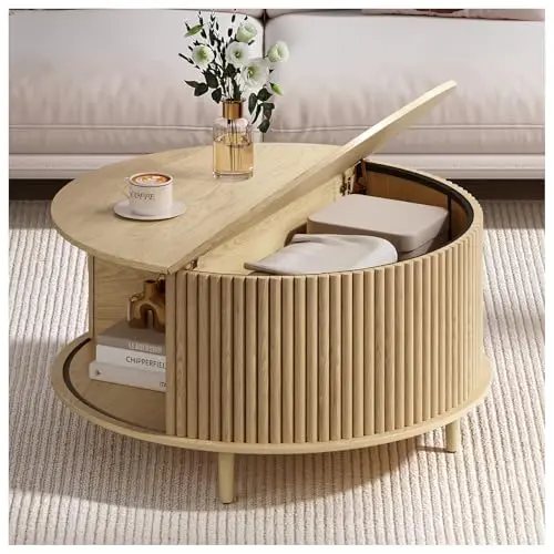 Round Fluted Coffee Table with Hidden Storage, Lift-Top Design & Side Open Shelf, Two-Layer Natural Wood Tabletop with Sliding Cabinet Doors, Sturdy Solid Wood Legs & Soft-Close Hinges, Ideal for Living Rooms & Small Spaces