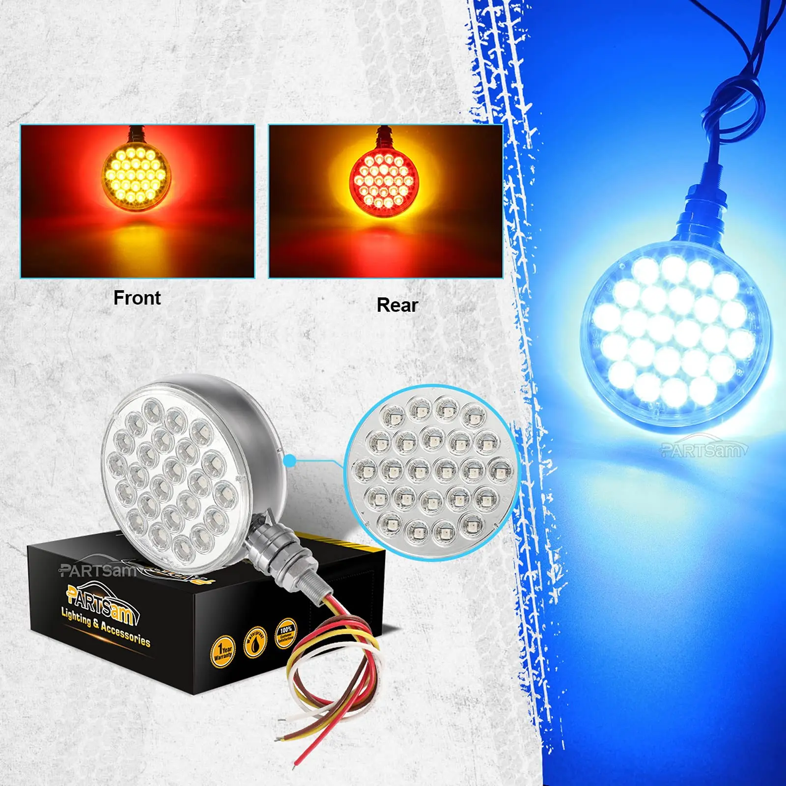 This double face led light is HARDWIRED with four plain wires - White is ground, which powers all three colors (amber lights, red lights, and blue lights); Brown wire is low brightness, which powers the marker lights function for both the amber and red sides; Red wire is high brightness, which powers the turn signal lights function for both the amber and red sides; The blue wire is for blue auxiliary lights, and both sides turns blue when powered;
