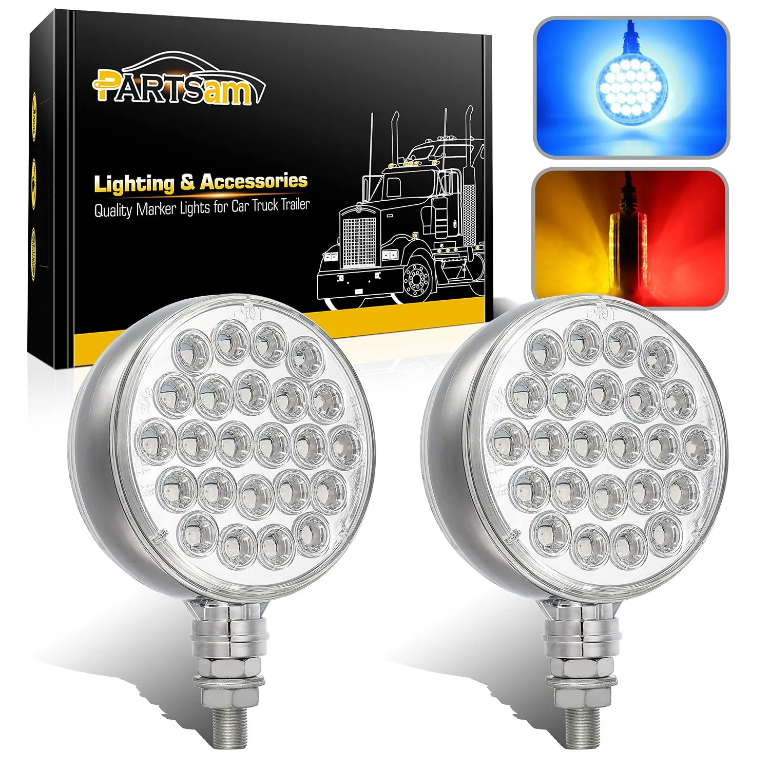 Package includes 2 Pieces 4" Amber/Red/Blue 48 Diode Double Face Round LED pedestal turn signal lights, Clear Lens;