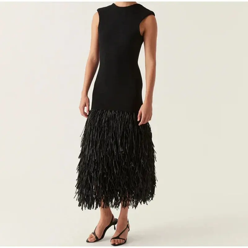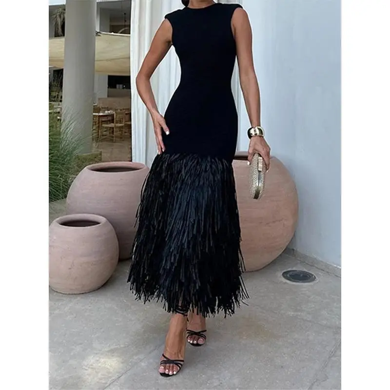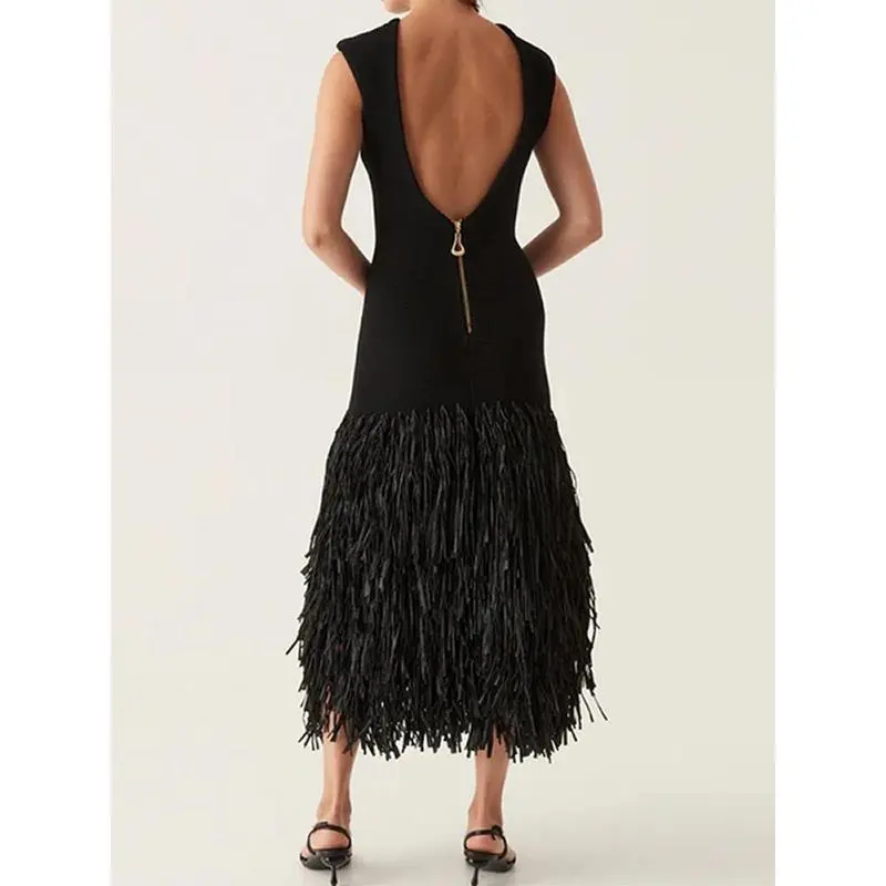 5. Round - neck sleepveless fringe-hem dress, 2024 fashionable long dress for party Formal Womenswear Anniversary Backless Black Chiffon