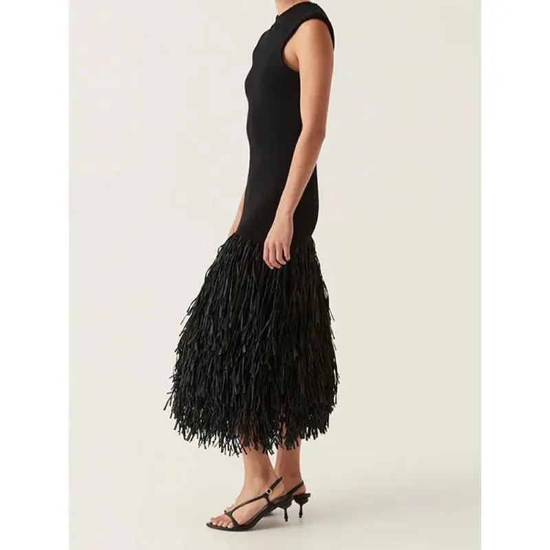 Round - neck sleepveless fringe-hem dress, 2024 fashionable long dress for party Formal Womenswear Anniversary Backless Black Chiffon