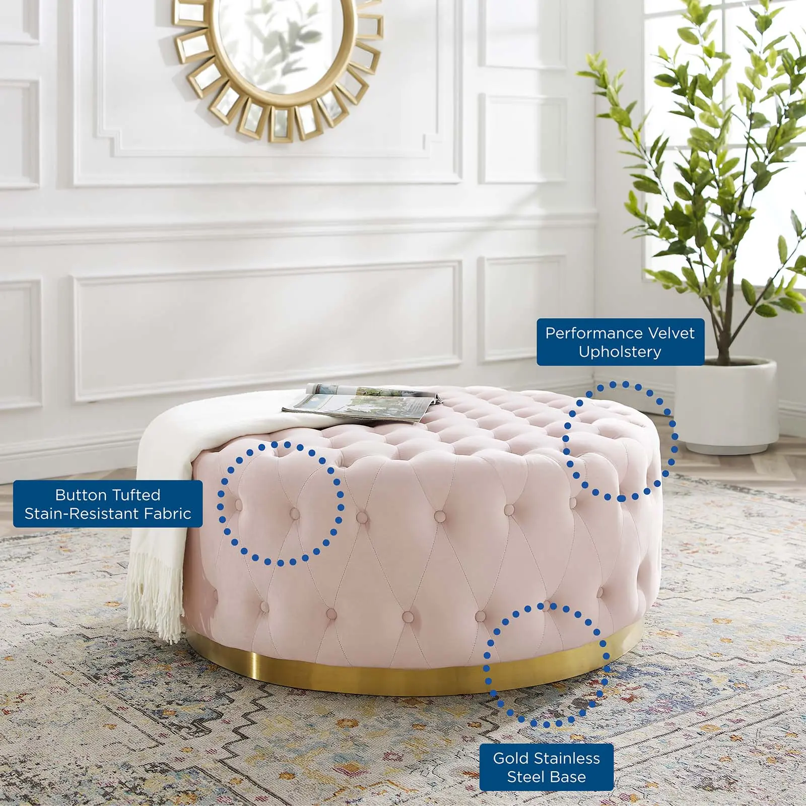 Revive decor in your living space with the Ensconce Tufted Performance Velvet Round Ottoman. Rich in tactile luxury and glam deco style, this round ottoman features deep button tufting and gold metal accents, and serves as both a comfortable choice for extra seating space or a unique coffee table in your living room. Covered in soft, stain-resistant performance velvet, this upholstered ottoman is densely padded in foam and rests atop a sturdy gold stainless steel base. Complete with plastic foot caps to protect flooring. Weight Capacity: 300 lbs.