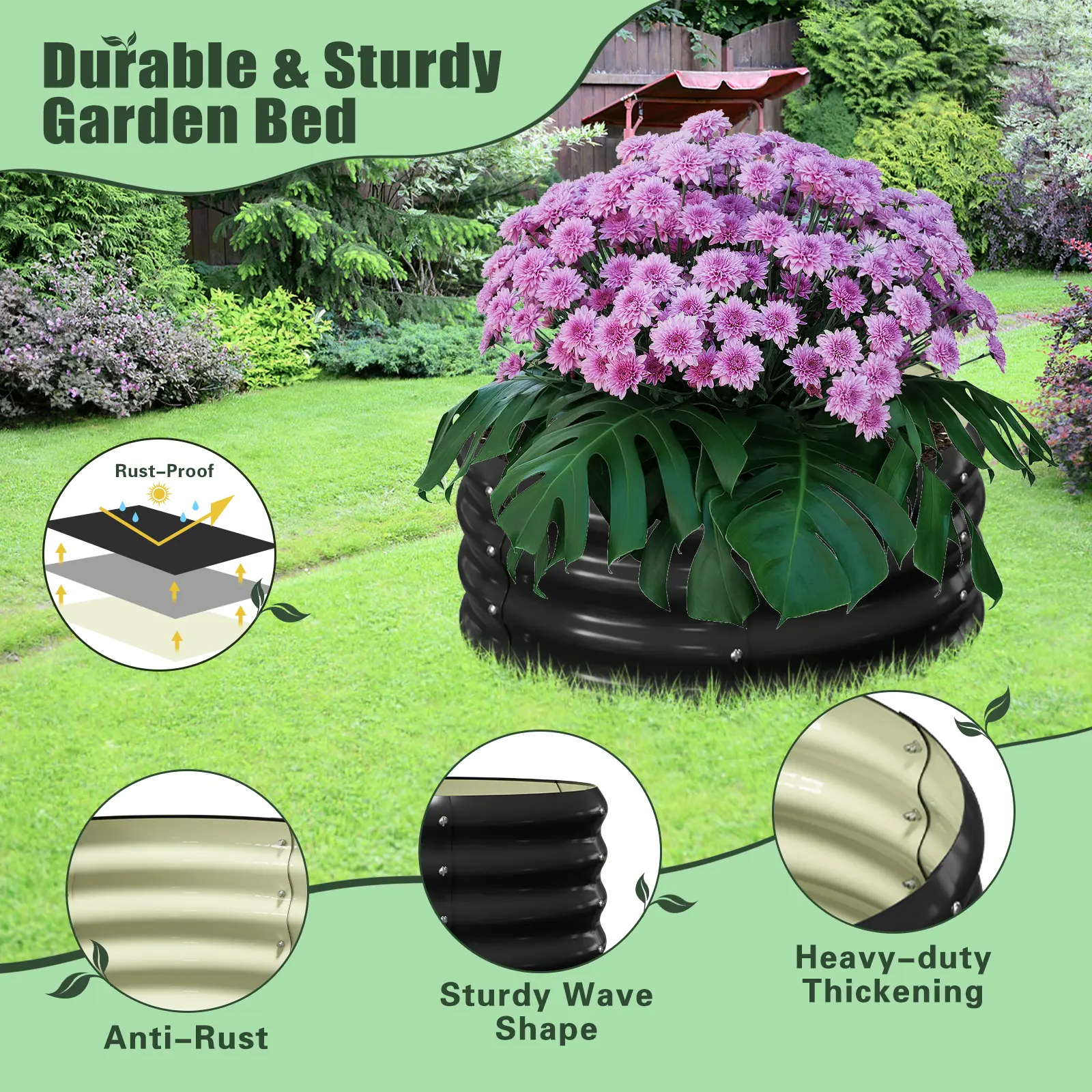 【Built to Last】: Lilypelle raised garden bed is made of galvanized metal plate and coated with multiple layers of powder coating for long-lasting durability. Wave structure and round shape, rust-proof and durable, can stay in contact with the soil for a long time and resist corrosion