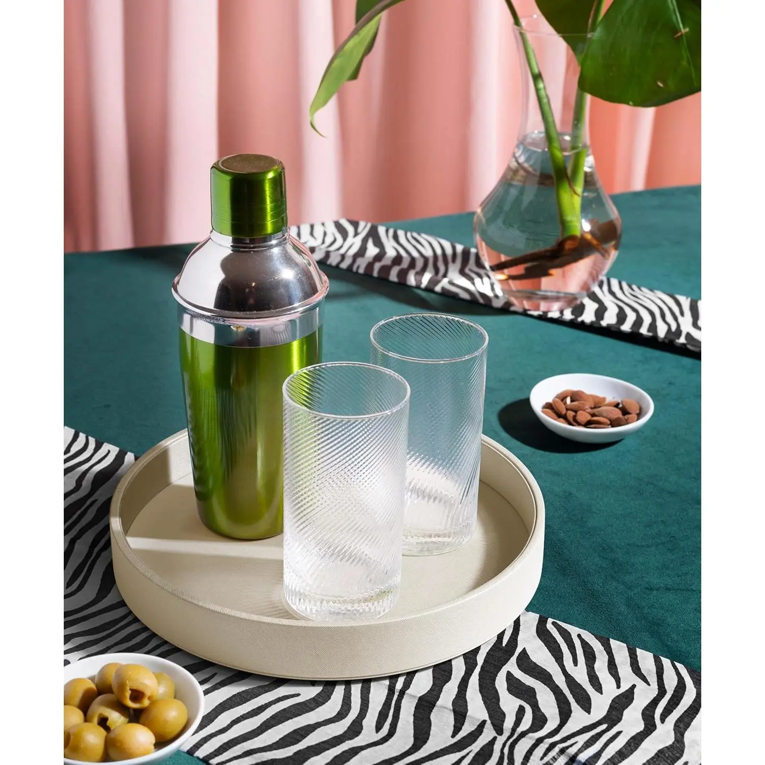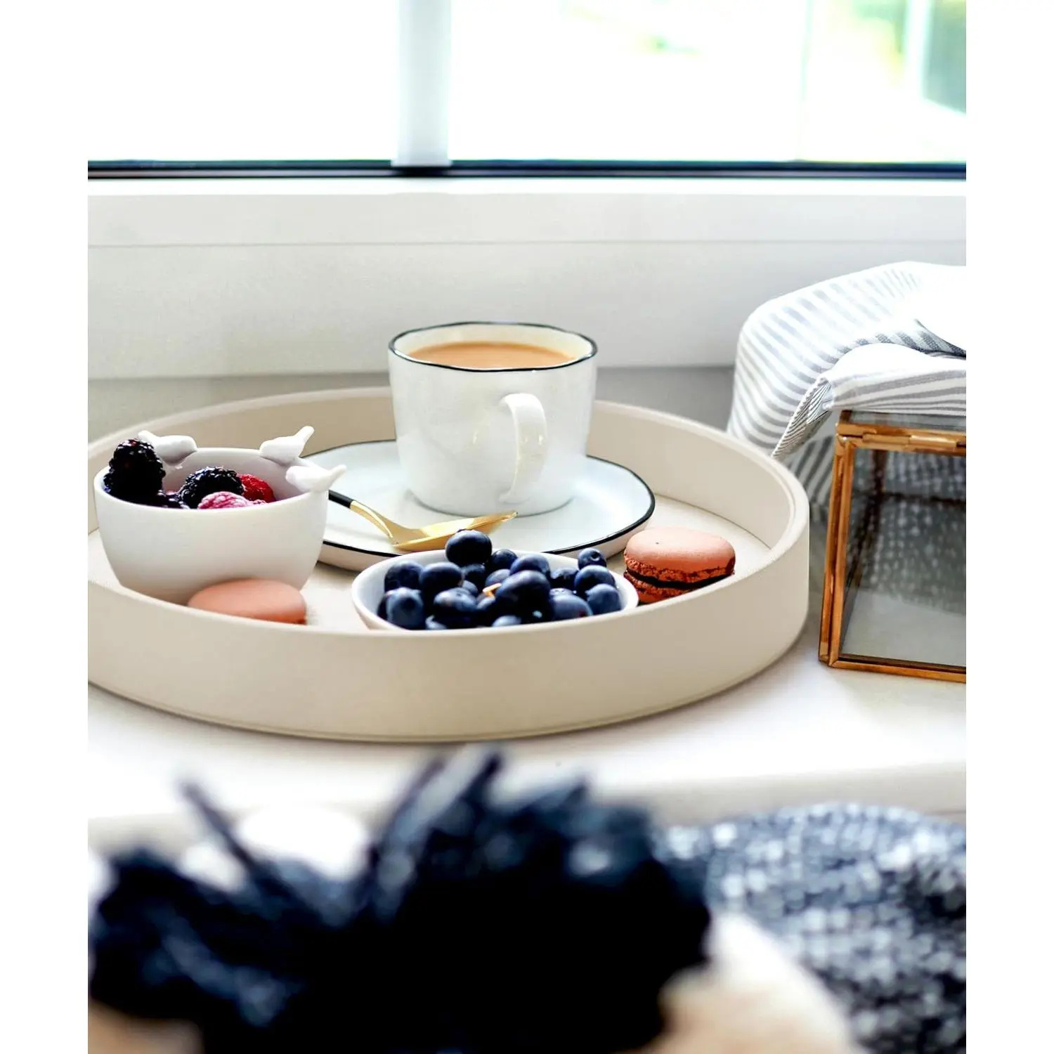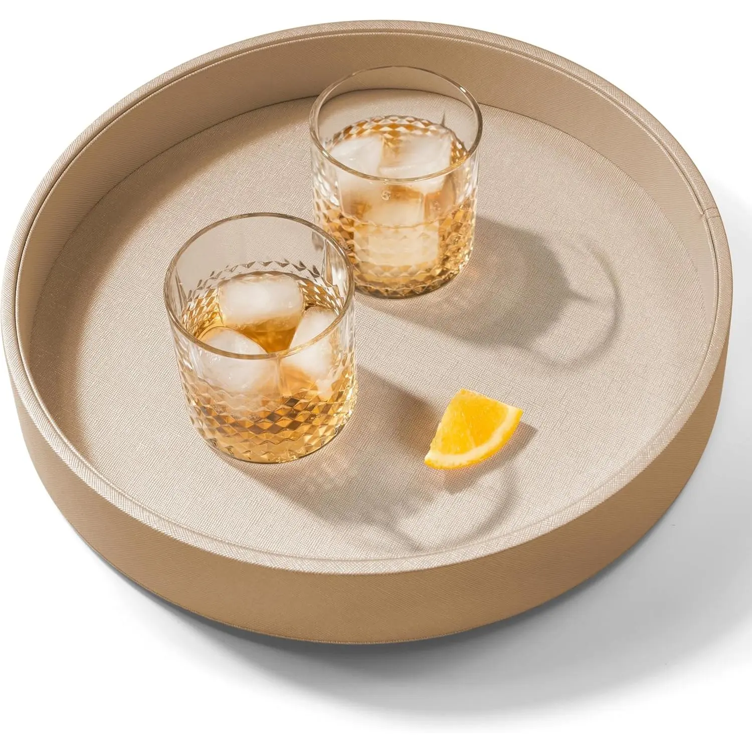 ROUND SERVING TRAY: Outer dimension: 12.6 inch diameter x 1.6 inch height / 32 cm diameter x 4 cm height, the handy size can be adapted to any situation of use.