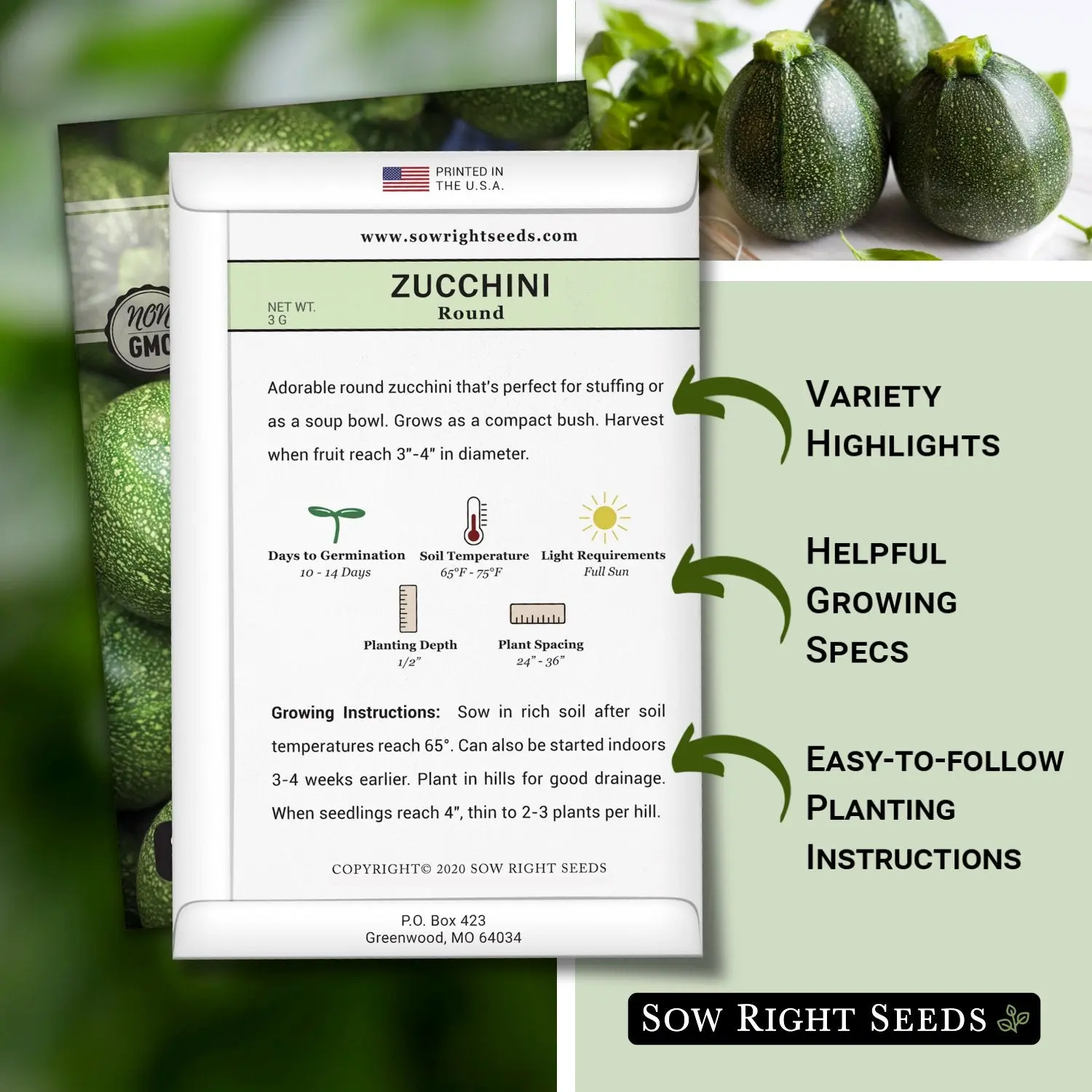 Round Zucchini (Cucurbita pepo) is an adorable round zucchini that's perfect for stuffing or as a soup bowl. Grows as a compact bush. Harvest when fruit reach 3"-4" in diameter. Seed packet contains 3 G (about 30 seeds).